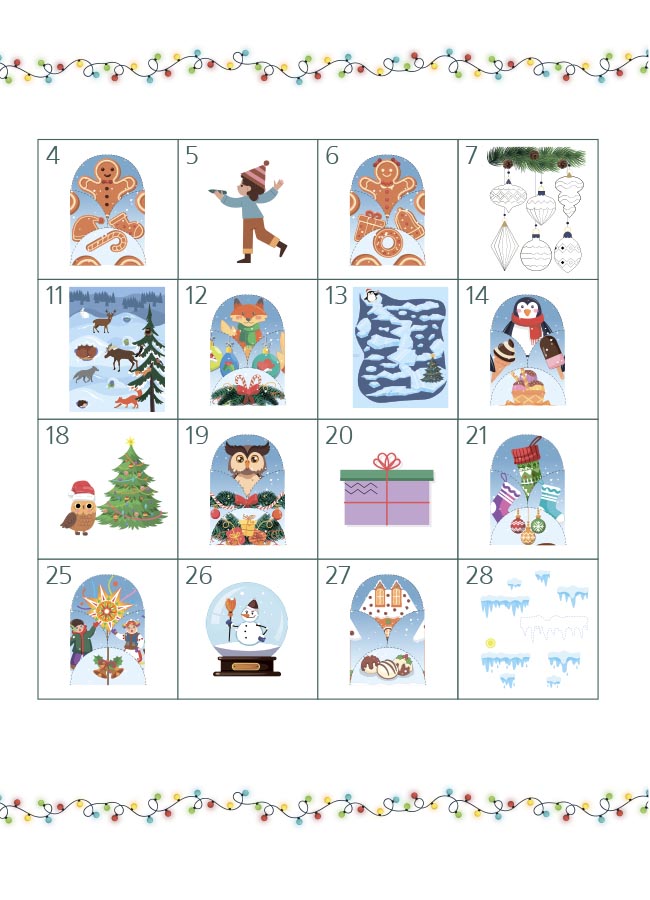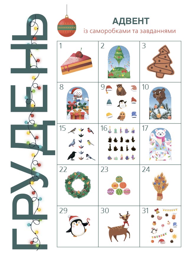 Цей зошит справжній скарб. Перед вами — дитячий простір для творчості, побудований за принципом адвент-видання.На його сторінках на дітей чекають зразок листа святому Миколаю, 13 саморобок та 18 завдань на кожен день очікування зимових свят.