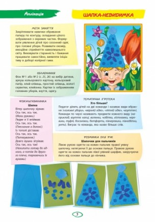 У кожній частині альбому пропонується матеріал для 20 інтегрованих занять з аплікації та ліплення. Всі заняття є особистісно орієнтованими і враховують вікові та індивідуальні особливості дітей. Навчання прийомам і технікам ліплення і аплікації ведеться від простого до складнішого. Тематика занять тісно пов’язана з сезонними явищами природи і святами ( «від осені до зими» в 1-й частині альбому і «від зими до літа» у 2-й) У «Додатках» пропонуються листи, на яких містяться заготовки для аплікацій, малюнки -фон, які малюк може прикрасити власним виробом з паперу, пластиліну, природних матеріалів.