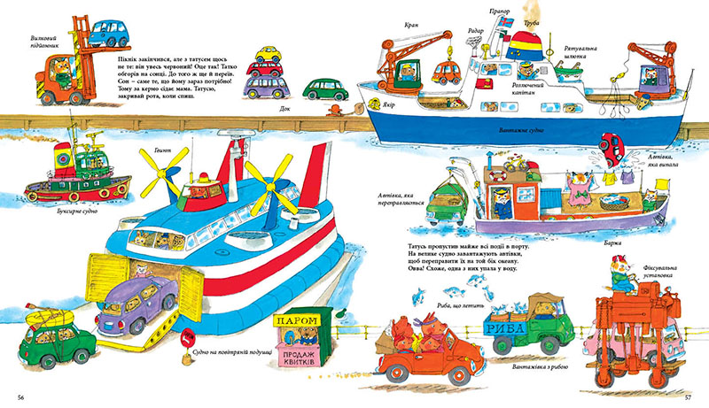 У світі Річарда Скаррі на кожному кроці чекають неймовірні пригоди! Ця яскрава, повна гумору книжка запрошує маленьких читачів у подорож країною найрізноманітніших автівок, вантажівок і всіляких дивовижних транспортних засобів. Тут є все: від буряковоза до крокодиломобіля, від гарбузомобіля до свинкофургона.