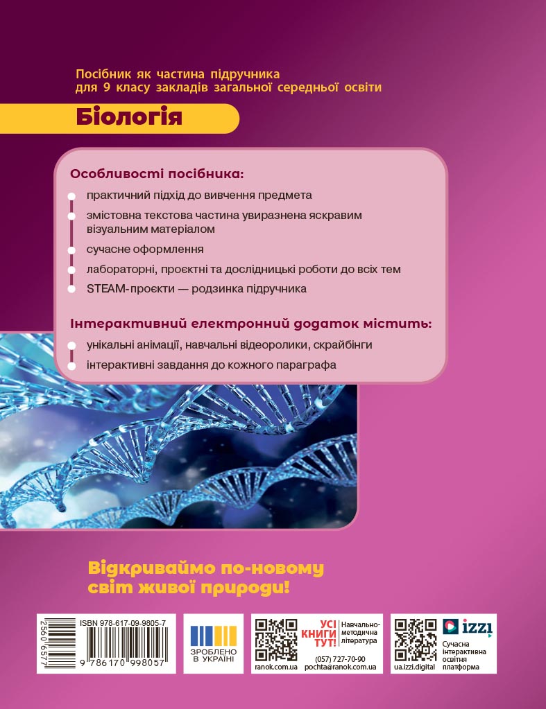 Вивчаймо біологію яскраво, легко, сучасно й по-новому! Навчальний матеріал базується на практичному підході. Тож учнівство відкриє для себе розмаїтий світ живої природи. Гармонійне поєднання новітнього та класичного підходів до навчання не залишить байдужими всіх учасників та учасниць освітнього процесу.