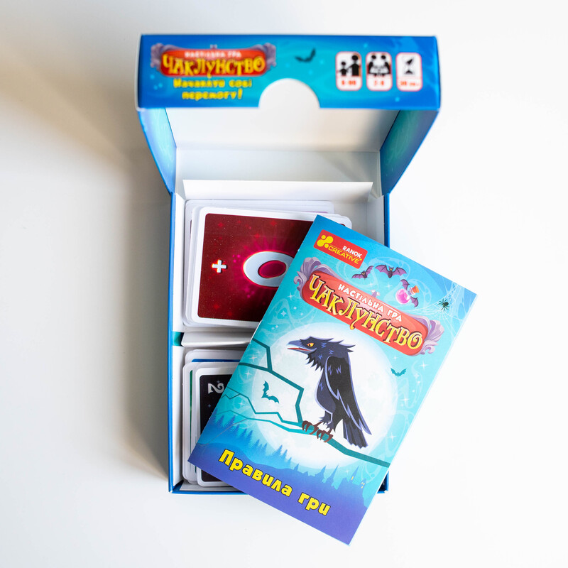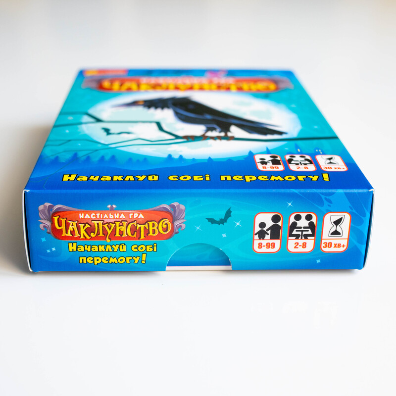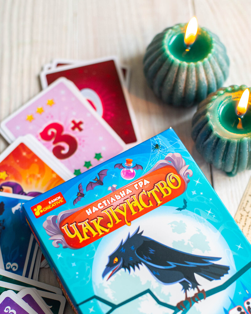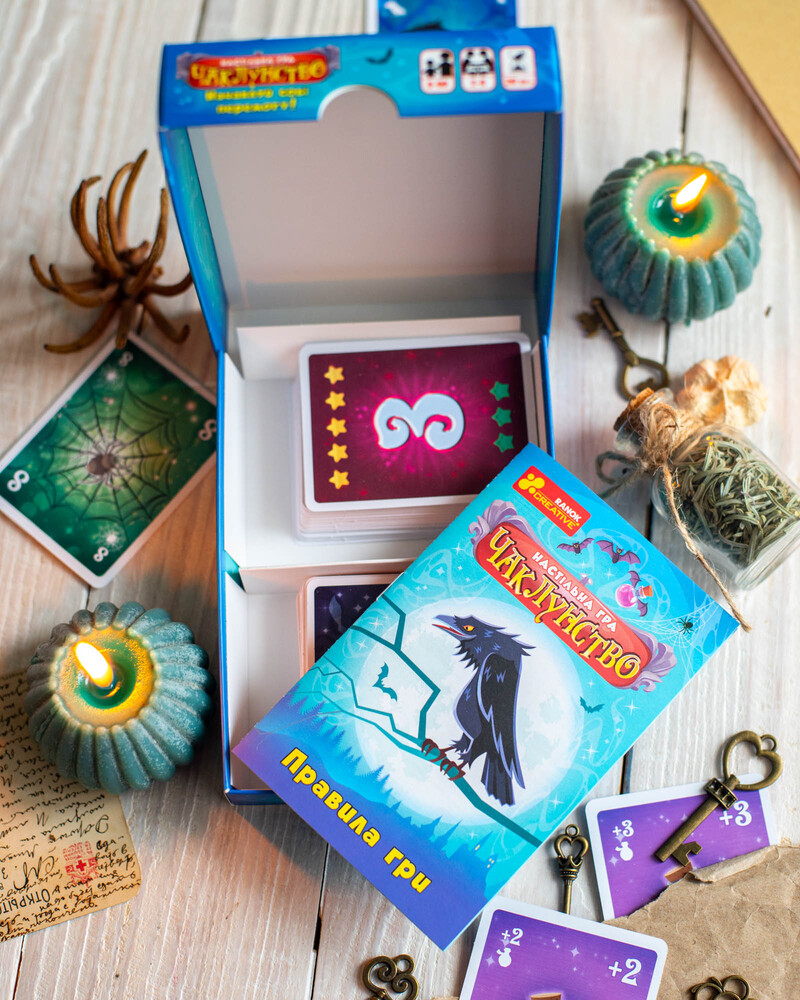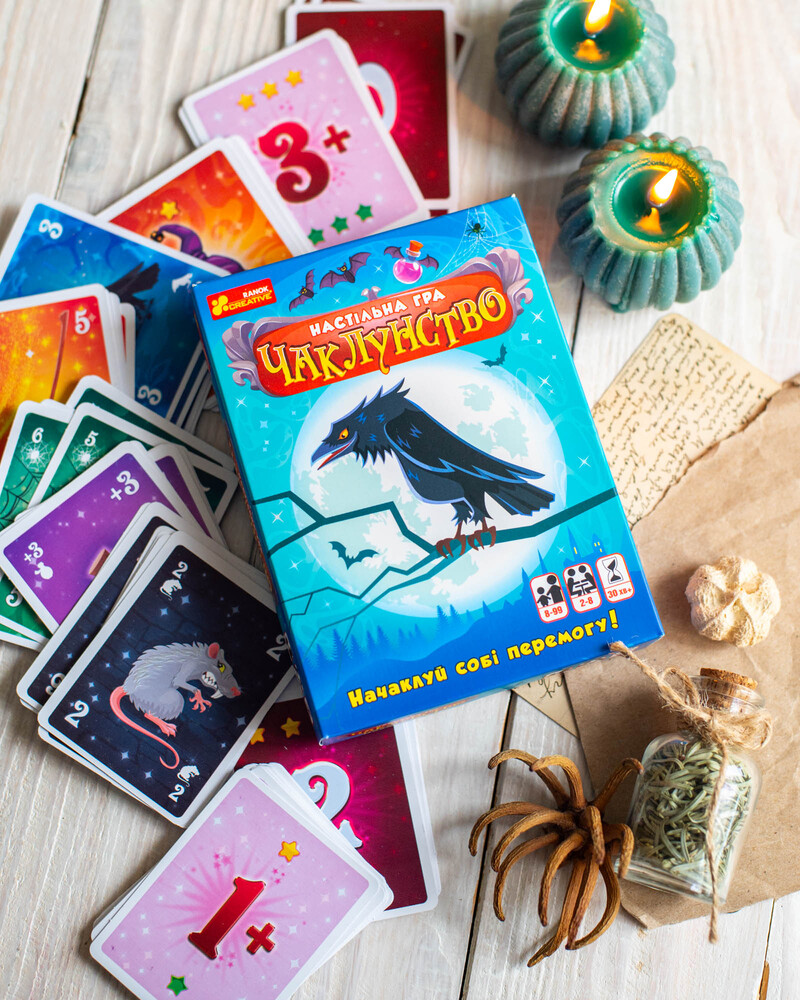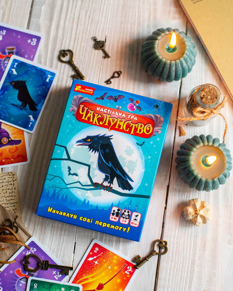 Чаклунство — динамічна карткова гра для 2–8 гравців із унікальною механікою передбачення. Гравці вгадують кількість своїх перемог у раунді, грають карти, застосовують «зілля» та збирають бали. Ідеально підходить для вечірок, доріг та подарунків. Компактний формат 110×150×30 мм. Вік: 8+. Час гри: 30 хв. У комплекті: 102 карти + правила.