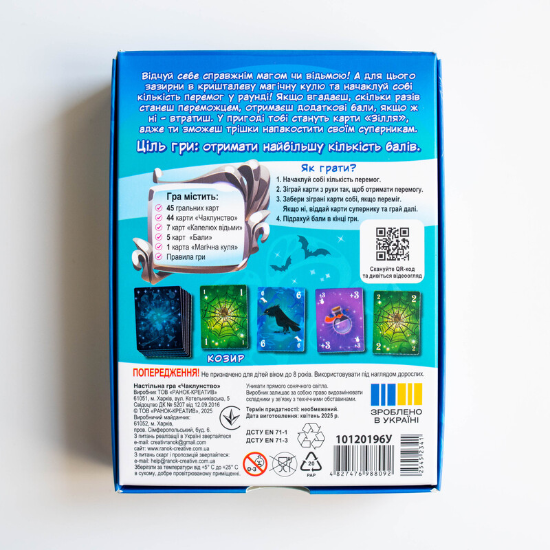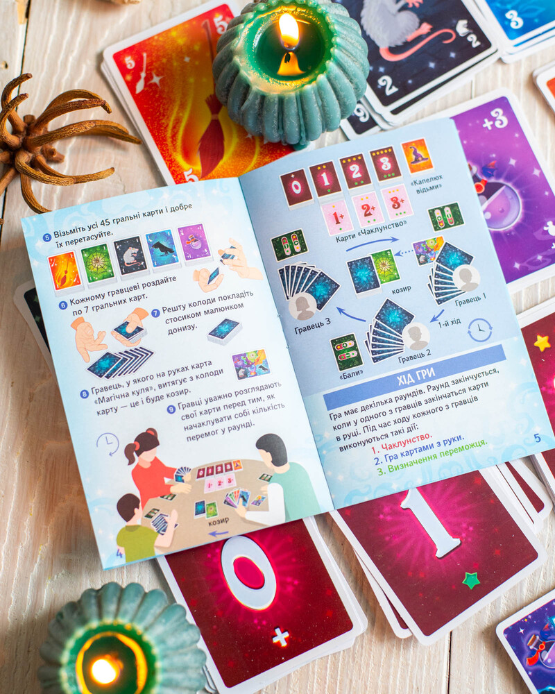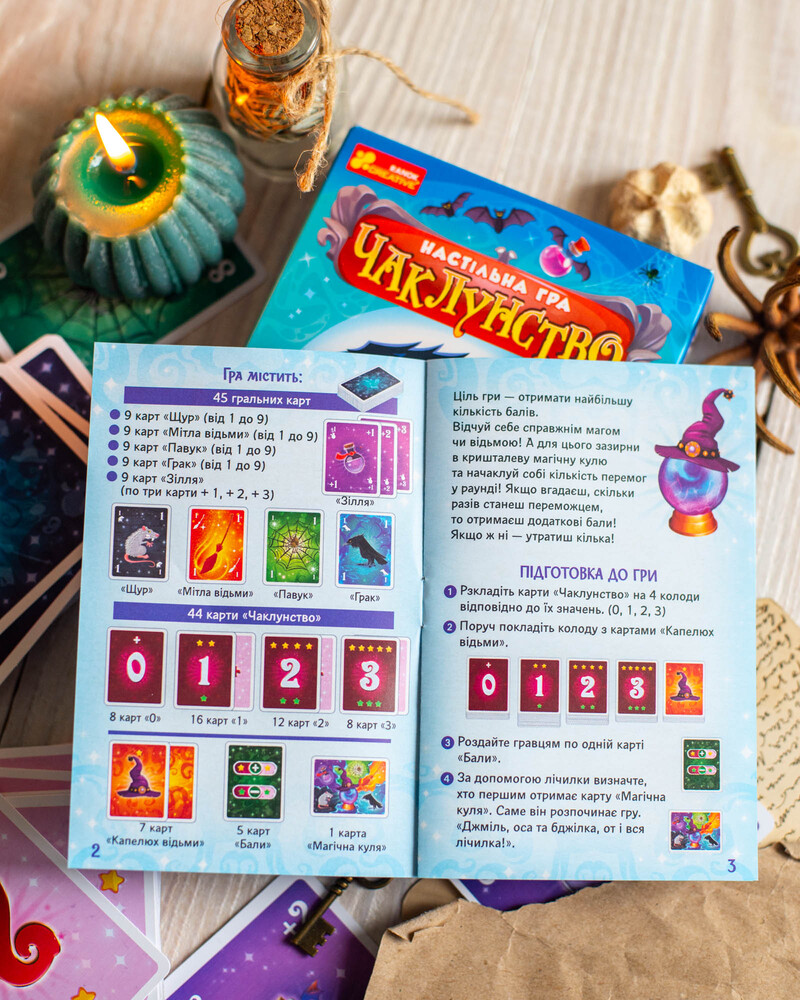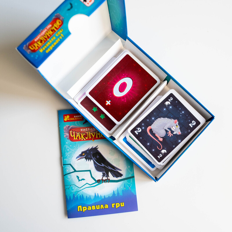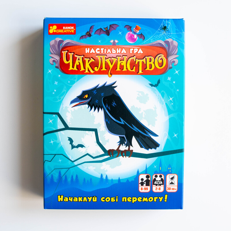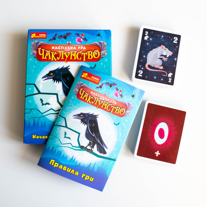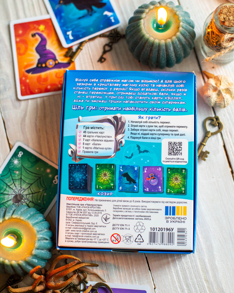 Чаклунство — динамічна карткова гра для 2–8 гравців із унікальною механікою передбачення. Гравці вгадують кількість своїх перемог у раунді, грають карти, застосовують «зілля» та збирають бали. Ідеально підходить для вечірок, доріг та подарунків. Компактний формат 110×150×30 мм. Вік: 8+. Час гри: 30 хв. У комплекті: 102 карти + правила.