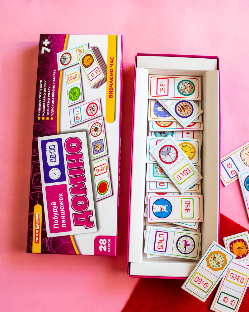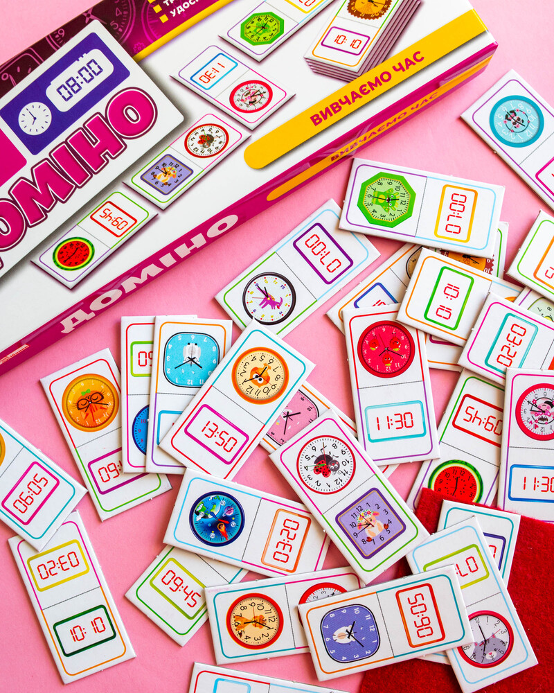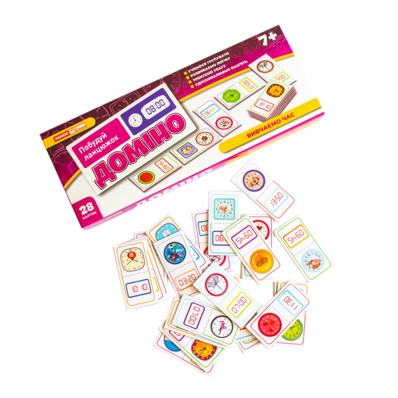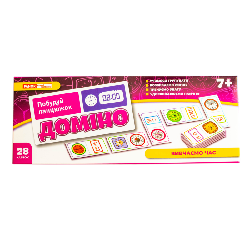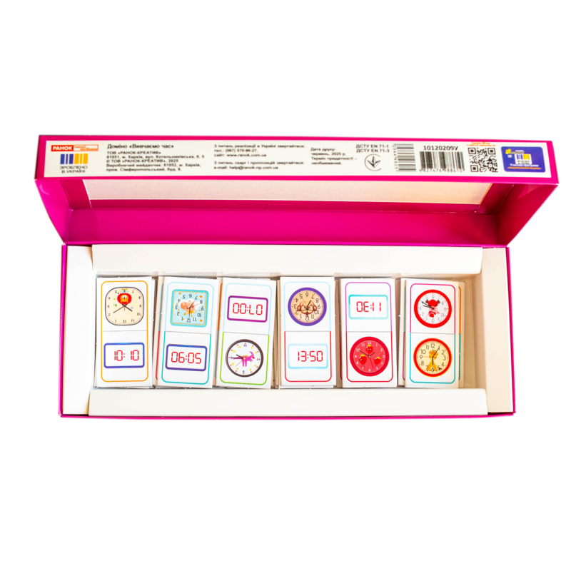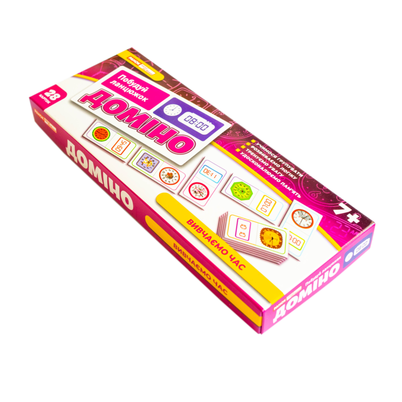 Доміно «Вивчаємо час» — це класична гра в оновленому форматі, що допомагає дітям легко навчитися визначати час. Малюки поєднують зображення на фішках, співставляючи електронний і механічний годинники, а кольорові рамочки підказують правильні відповіді. Така форма гри формує розуміння часу природно й цікаво, розвиває логіку, увагу, памʼять і навички групування. Гра має прості правила, швидко захоплює дітей і зручно підходить для занять удома, у школі, садочку або з логопедом. Компактна коробка дозволяє брати її з собою в дорогу.