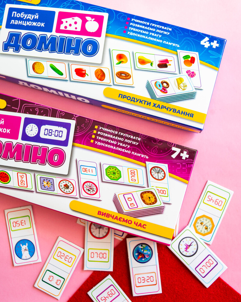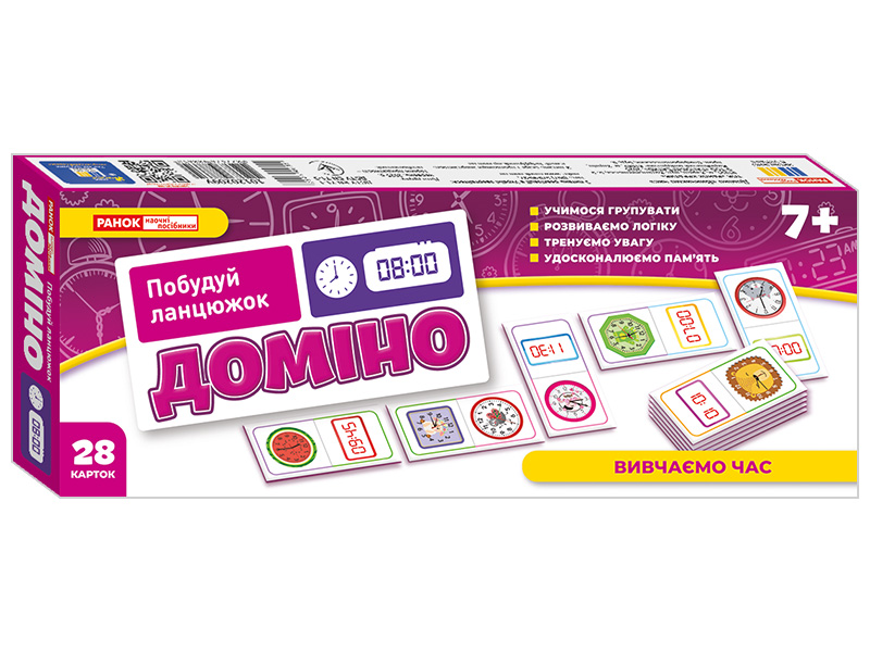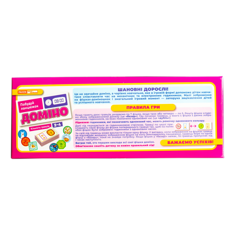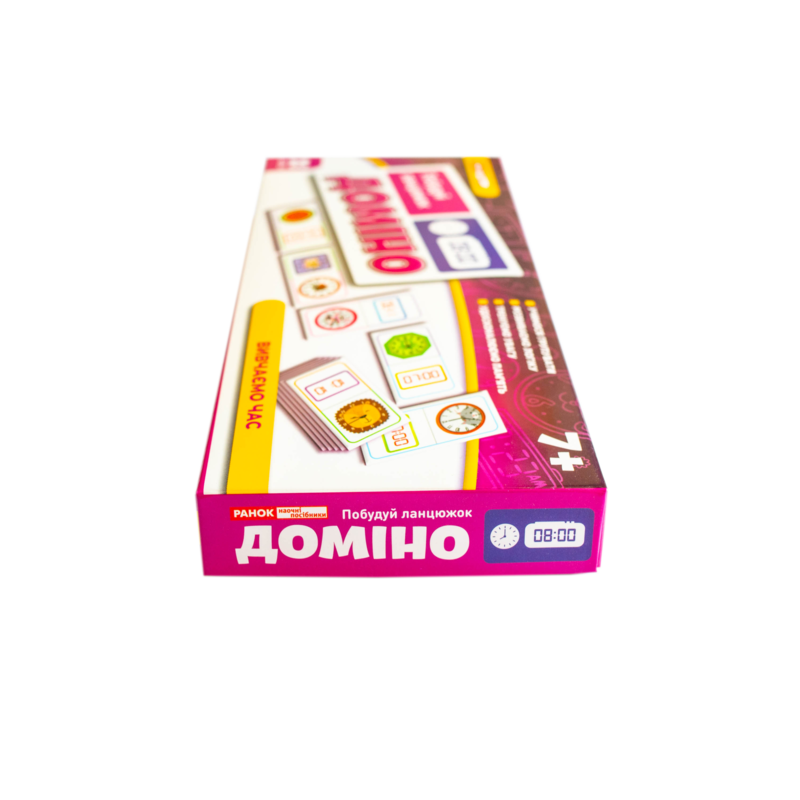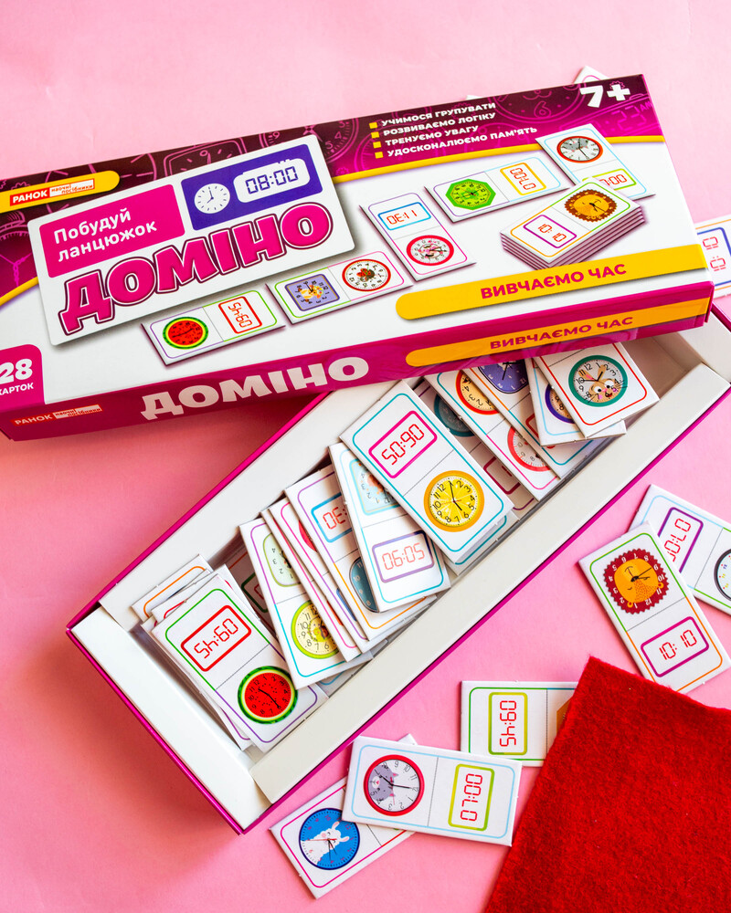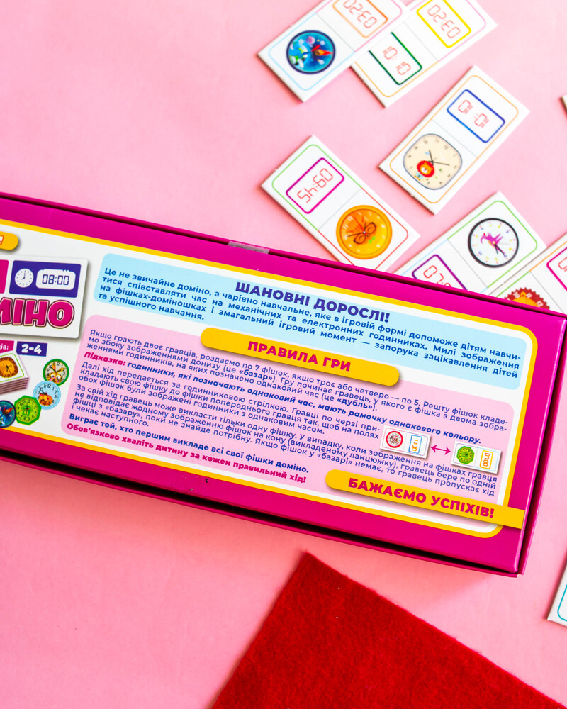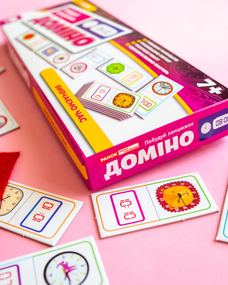 Доміно «Вивчаємо час» — це класична гра в оновленому форматі, що допомагає дітям легко навчитися визначати час. Малюки поєднують зображення на фішках, співставляючи електронний і механічний годинники, а кольорові рамочки підказують правильні відповіді. Така форма гри формує розуміння часу природно й цікаво, розвиває логіку, увагу, памʼять і навички групування. Гра має прості правила, швидко захоплює дітей і зручно підходить для занять удома, у школі, садочку або з логопедом. Компактна коробка дозволяє брати її з собою в дорогу.