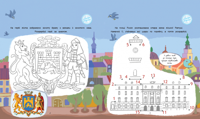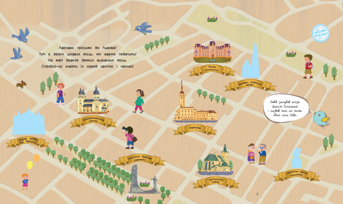 Книга з висічкою-ручкою та наліпками для малюків. У серії зібрано ігрові завдання йфакти про визначні місця українських міст: Києва, Харкова, Одеси і Львова.