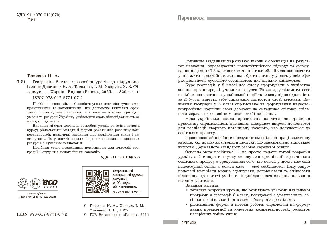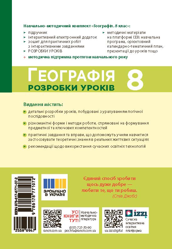 Посібник створений, щоб зробити уроки географії сучасними, практичними та захопливими. Він допоможе вчителям ефективно організувати навчання, а учням — пізнати природні умови та ресурси України, усвідомити свою відповідальність за майбутнє держави.
