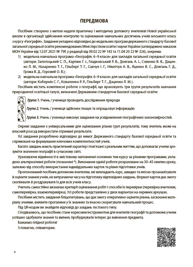 Посібник підготовлений відповідно до вимог нового Державного стандарту базової загальної середньої освіти, Типової освітньої програми для 5–9-х класів закладів загальної середньої освіти, змісту всіх чинних модельних навчальних програм курсу «Географія» для 8-го класу для закладів загальної середньої освіти (автори: Кобернік С. Г., Коваленко Р. Р. та ін.; Запотоцький С. П., Карпюк Г. І. та ін.), рекомендованих Міністерством освіти і науки України.