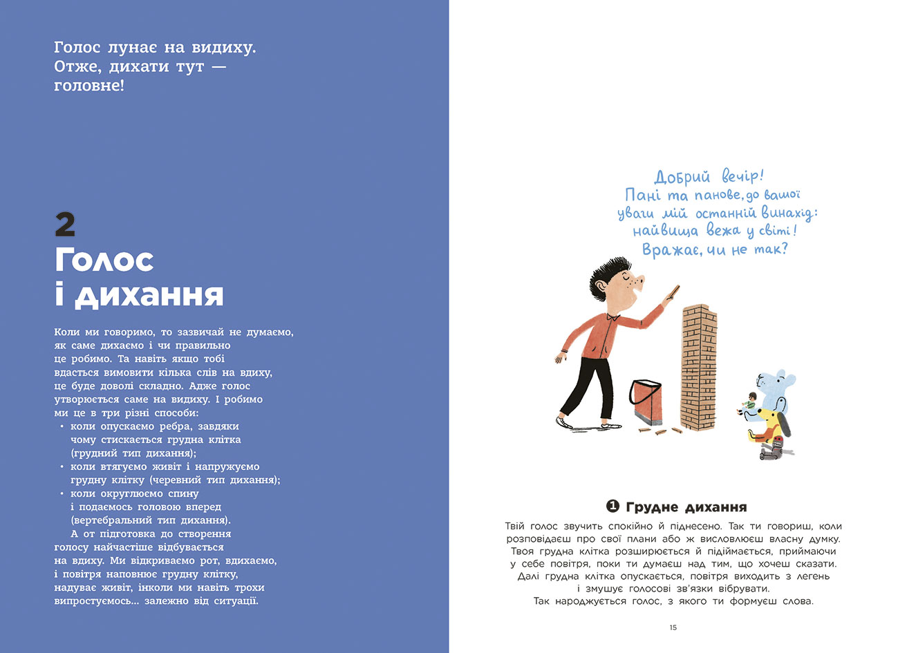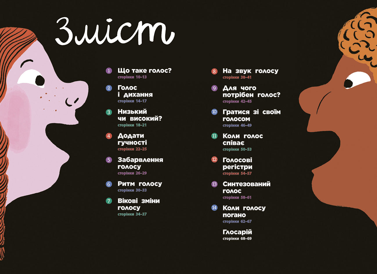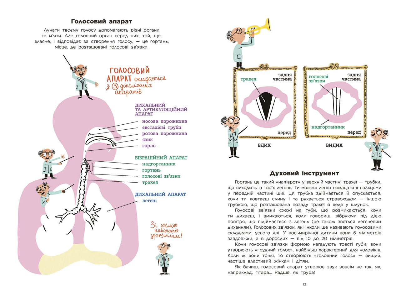 Це енциклопедія для допитливих дітей, які намагаються пізнати своє тіло з усіх сторін. На черзі загадковий голос. Як він утворюється? Чому в когось голос високий, а в когось низький? Чи зміниться він з віком? Як його натренувати й виспівувати ноти? На всі ці запитання у книжці відповідає лікар-фоніатр Франсуа Ле Уш. Зрозумілою дітям мовою він пояснює про дихання й голосові зв’язки, тембр і діапазон, зміну голосу в підлітків, типи голосу від сопрано до басу та навіть про штучний голос роботів.