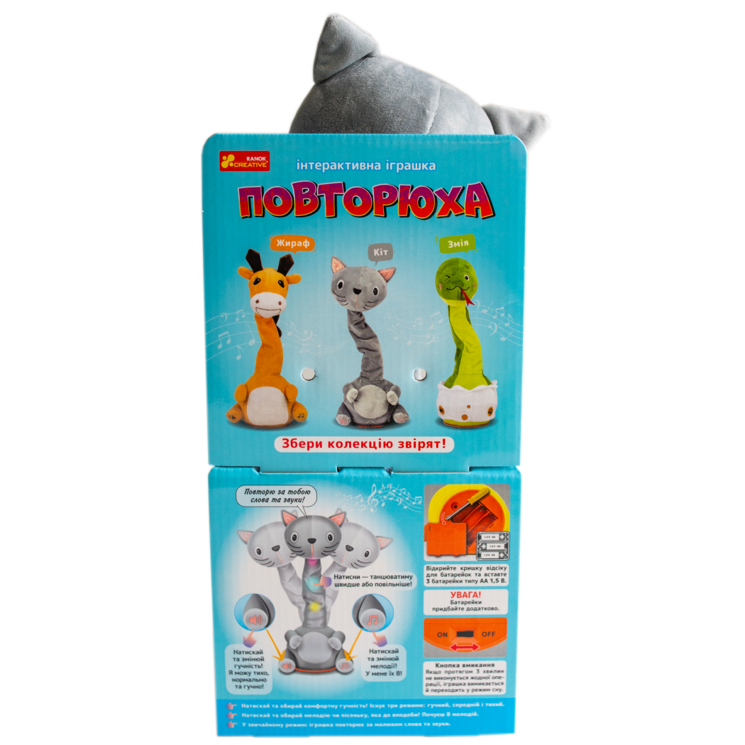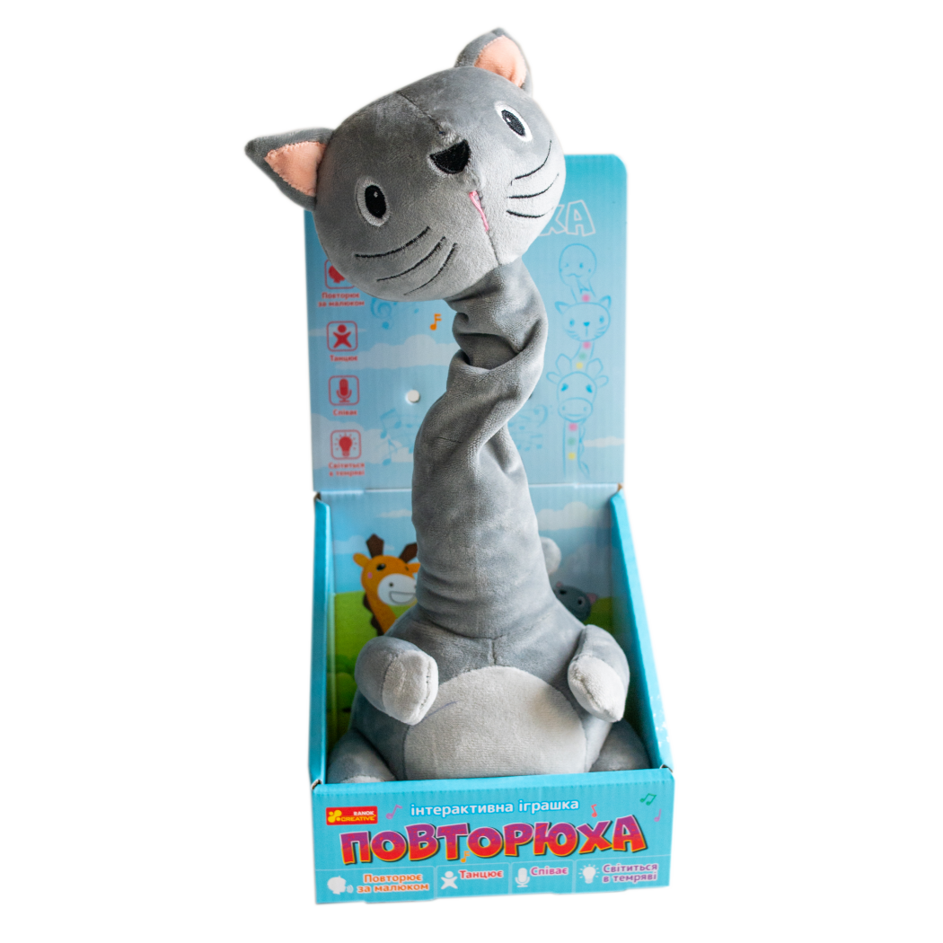Інтерактивна іграшка «Котик» оживає в руках малюка! Вона повторює слова та звуки, співає, танцює та світиться, даруючи радість і веселощі. М’які вушка, лапки та животик надзвичайно приємні на дотик. Миготлива підсвітка та 8 мелодій, три режими гучності — для будь-якої ситуації. Розмір ~360 × ~150 мм, постачається в яскравому дисплеї. Чудовий подарунок для малюків, який приносить радість і розваги щодня.