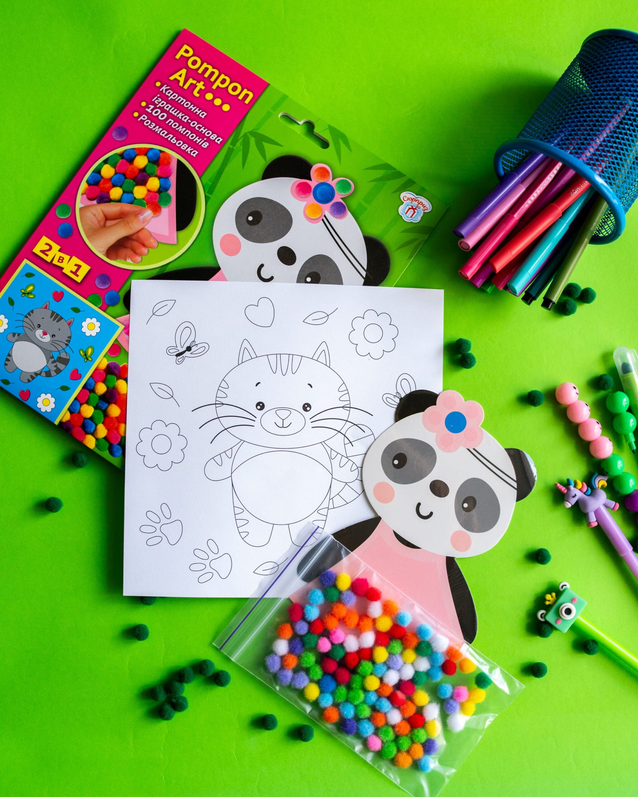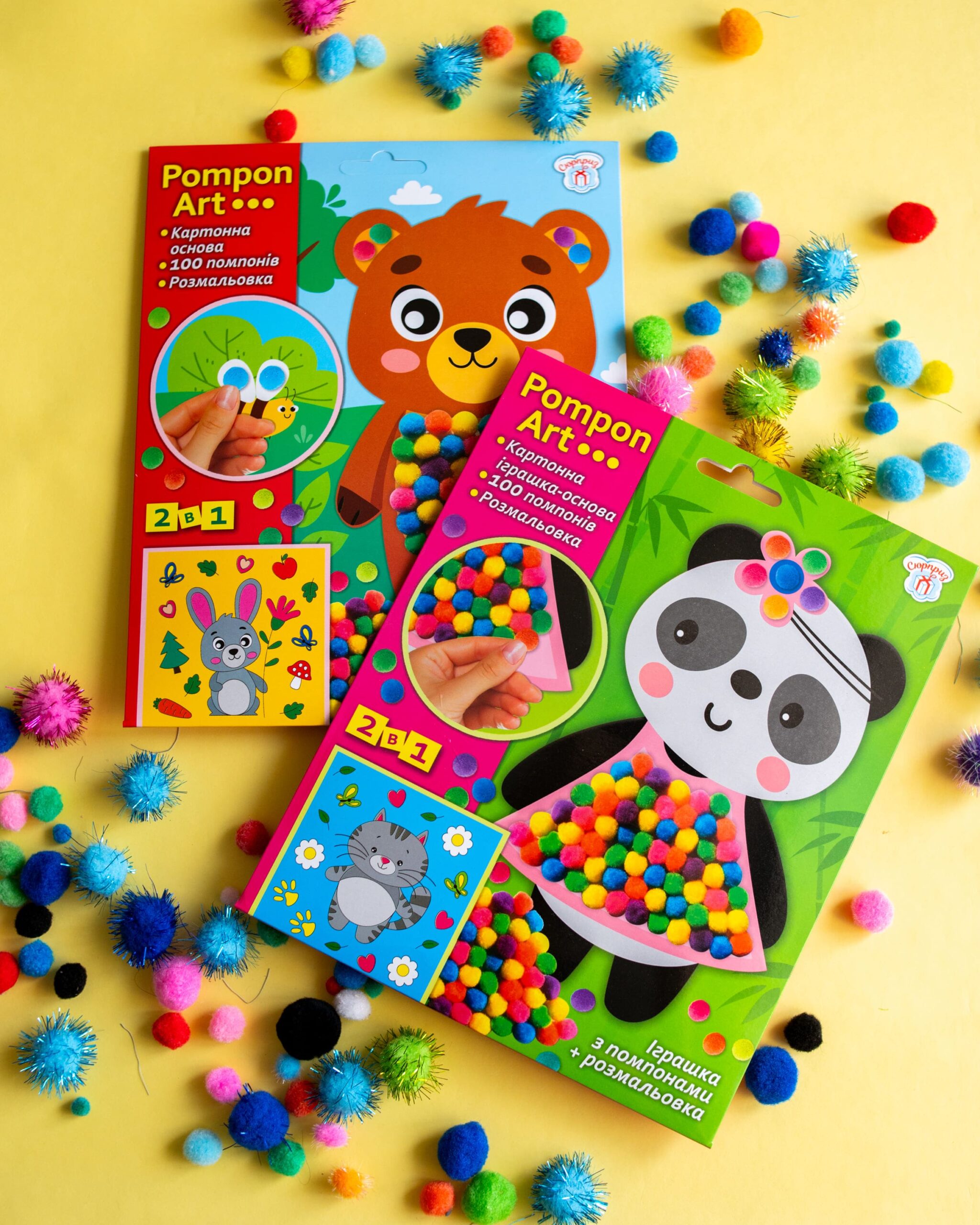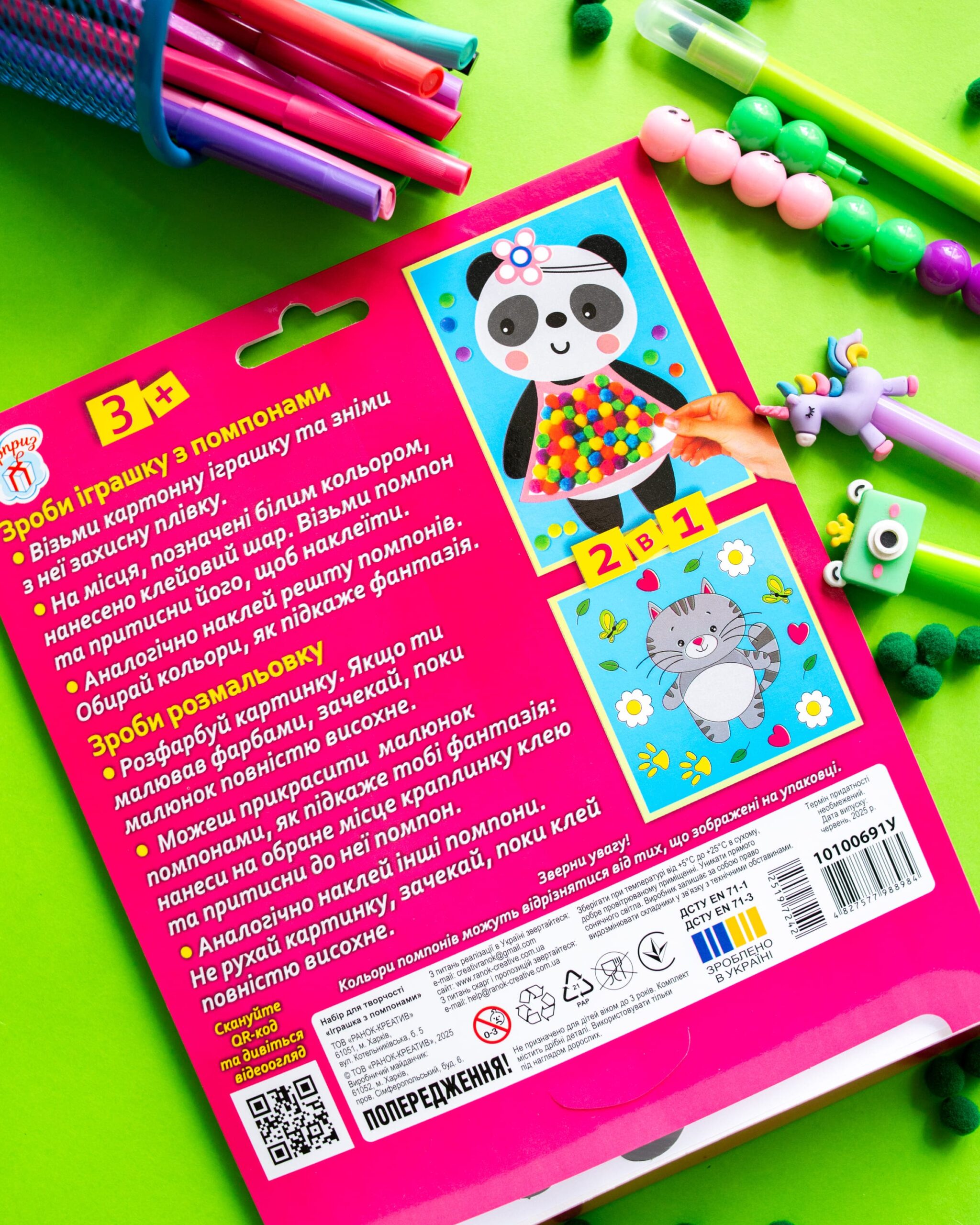 2 в 1! Іграшка-помпон + розмальовка в одному наборі! Малюки від 3 років зможуть легко створити свою першу поробку.