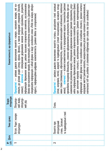 Запропонований календарно-тематичний план розроблено у відповідності до програми «Зарубіжна література» 5—9 класи (затверджена Наказом Міністерства освіти і науки України від 07.06.2017 № 804) з урахуванням засадничих ідей особистісно зорієнтованого і компетентнісного підходів у навчанні. Видання призначене вчителям загальноосвітніх навчальних закладів.