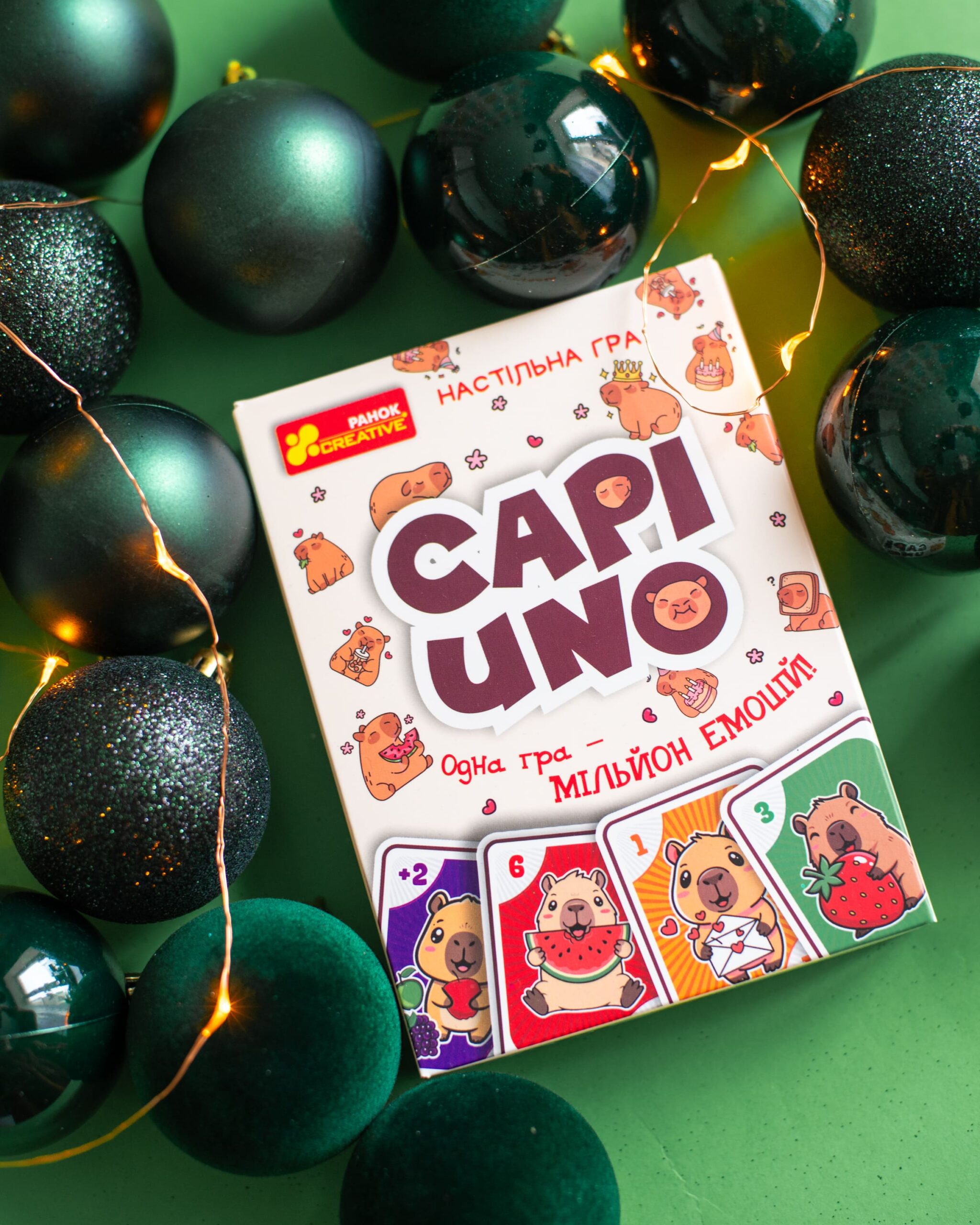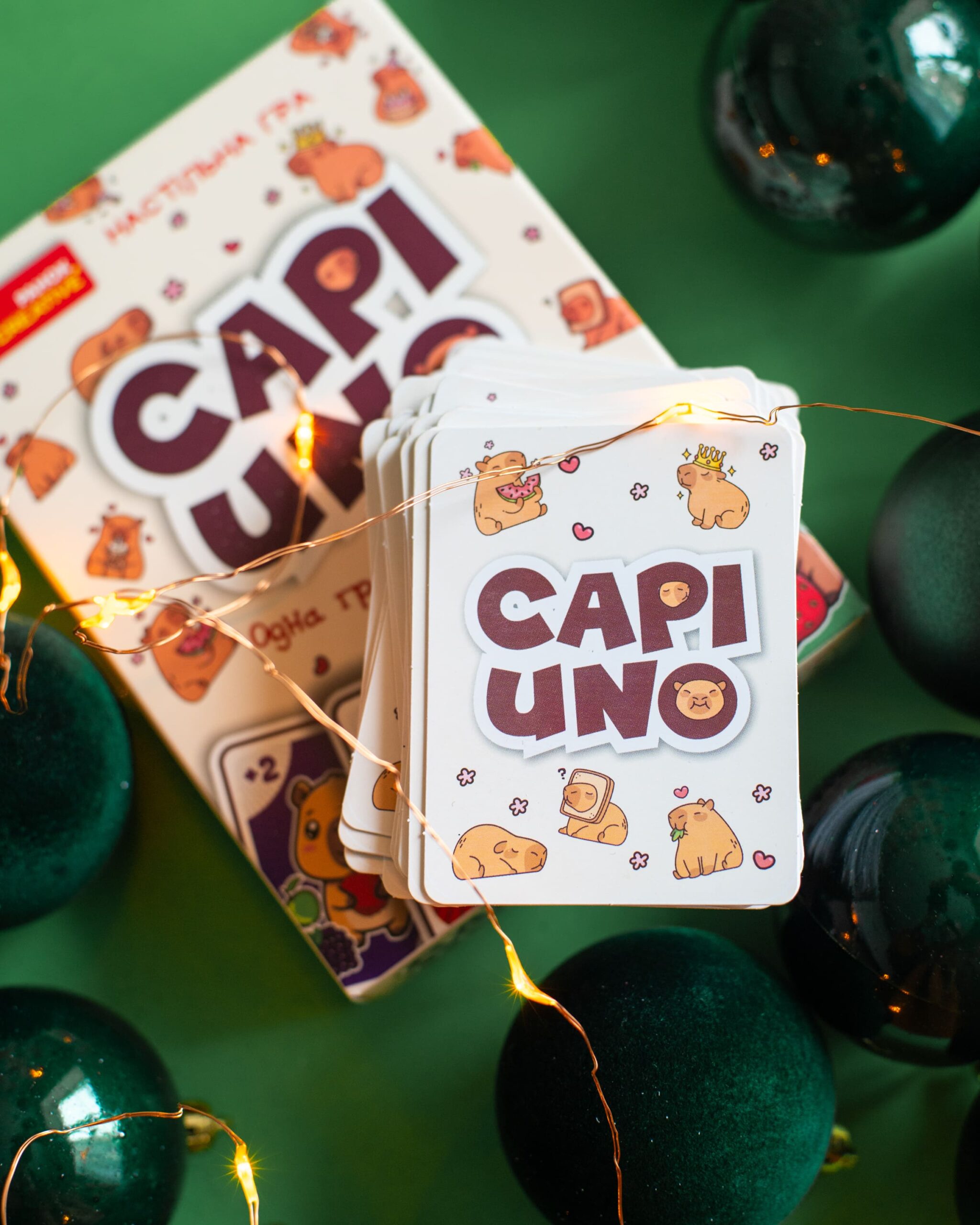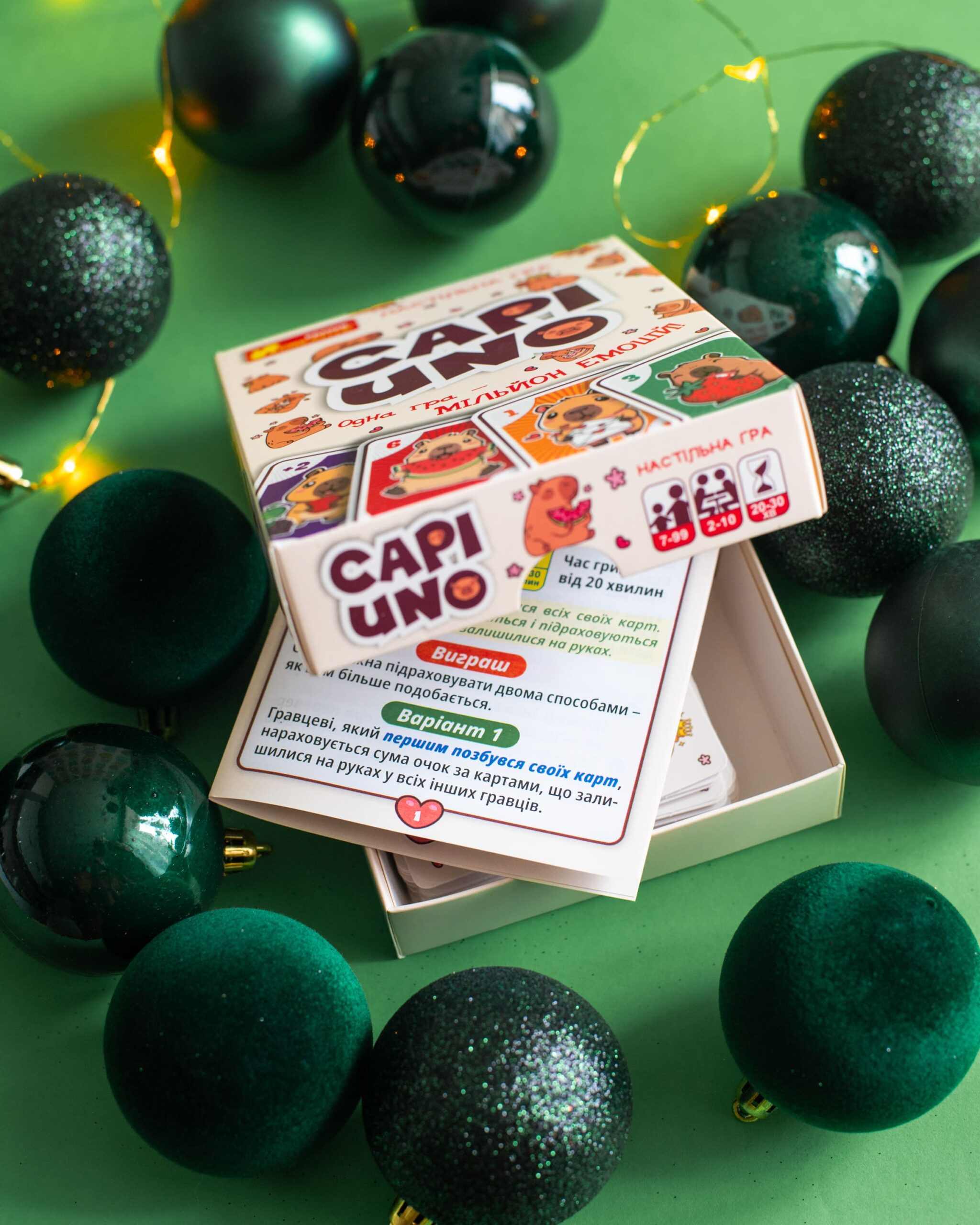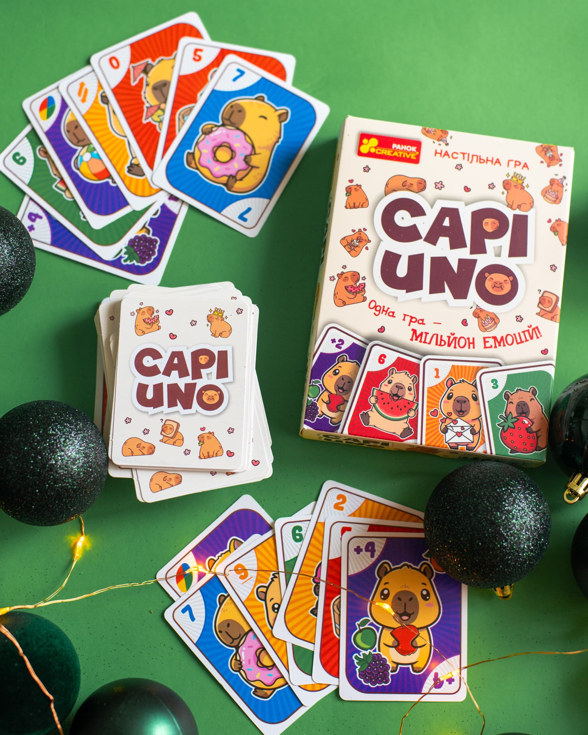 CAPIUNO – КапіУНО дарує мільйон емоцій у компактному форматі! Гра розрахована на 2–10 гравців і триває 20–30 хвилин, але азарту вистачить на весь вечір. Завдання просте — першим позбутися карт, а виграти можна у двох варіантах підрахунку очок. Родзинка гри — картки із зображеннями милих та популярних капібар, які вже стали зірками соцмереж. У наборі: 76 цифрових, 8 спеціальних, 24 карти із завданнями та правила.