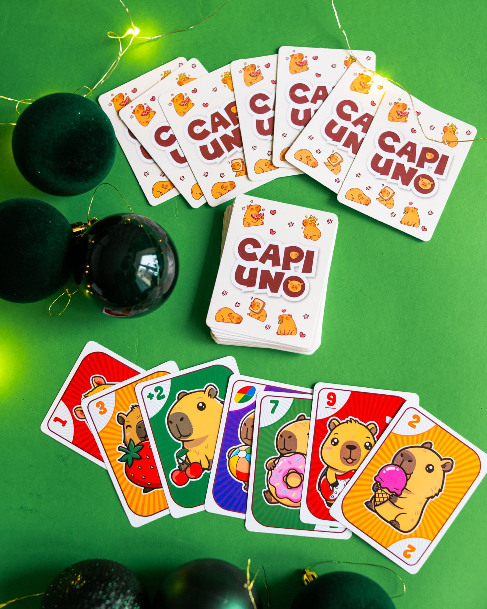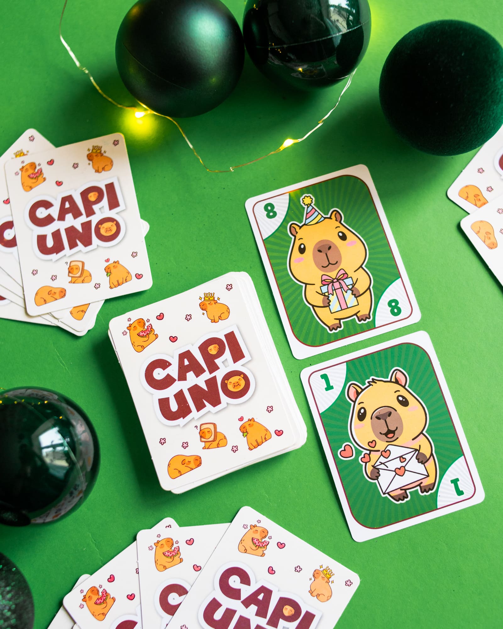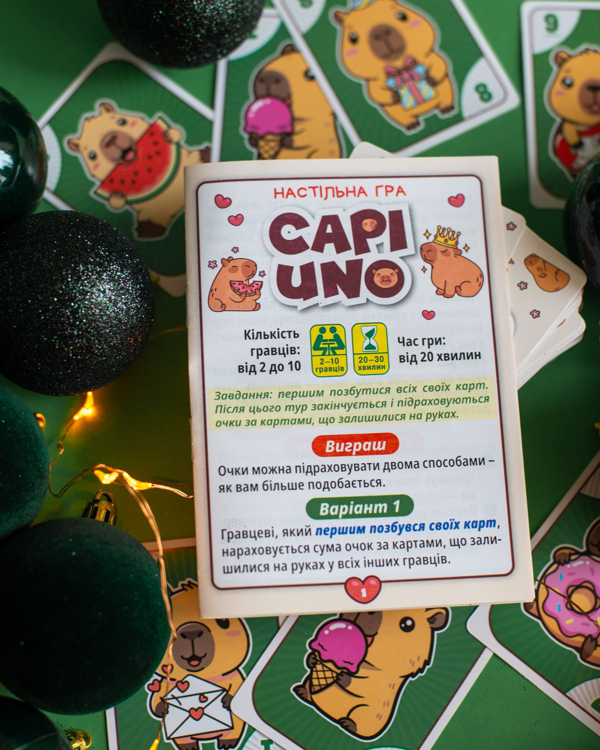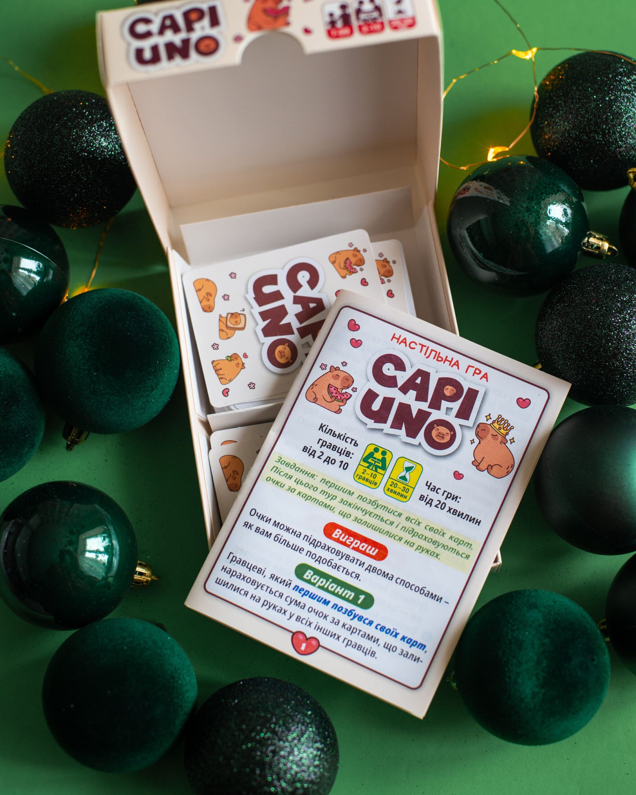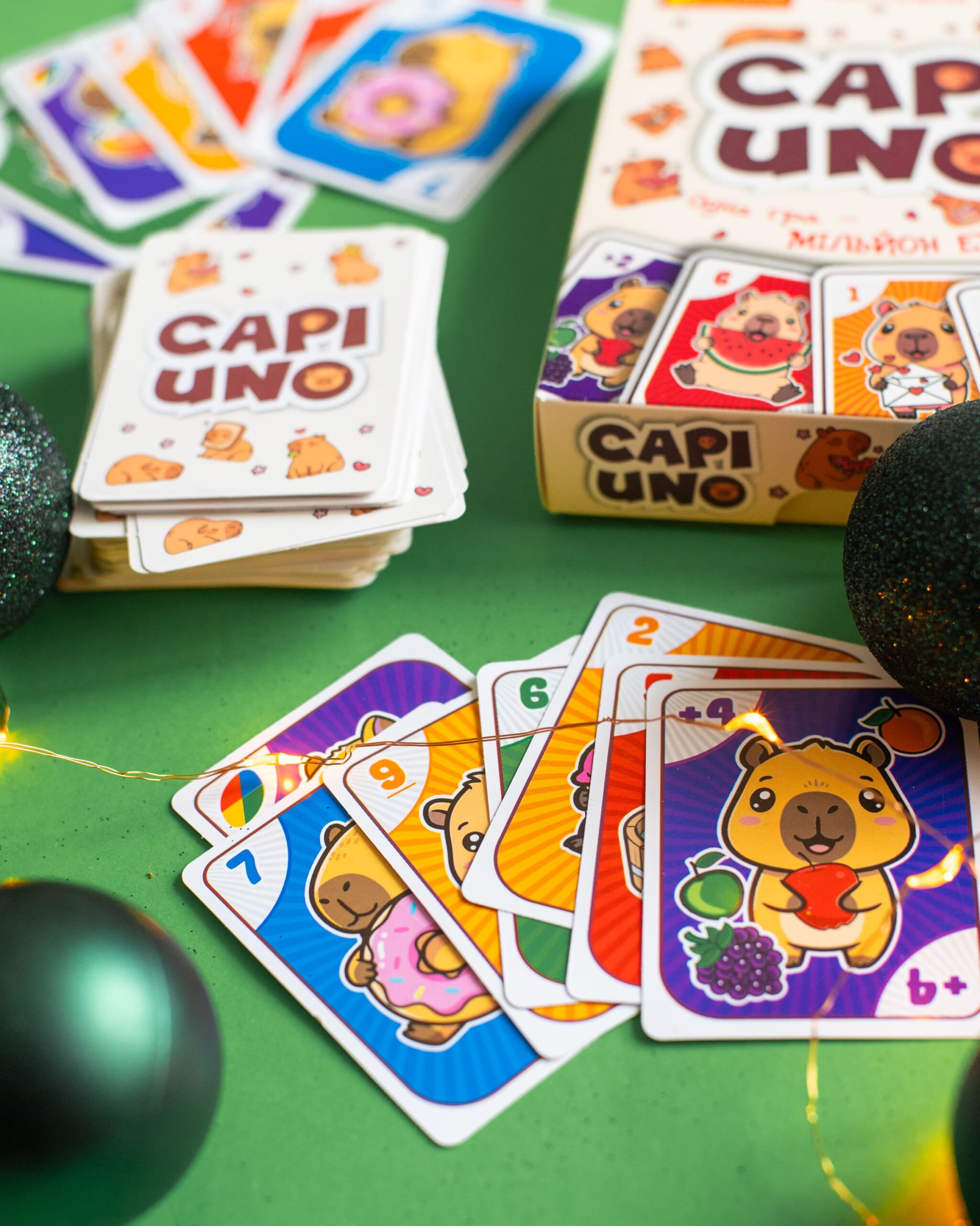 CAPIUNO – КапіУНО дарує мільйон емоцій у компактному форматі! Гра розрахована на 2–10 гравців і триває 20–30 хвилин, але азарту вистачить на весь вечір. Завдання просте — першим позбутися карт, а виграти можна у двох варіантах підрахунку очок. Родзинка гри — картки із зображеннями милих та популярних капібар, які вже стали зірками соцмереж. У наборі: 76 цифрових, 8 спеціальних, 24 карти із завданнями та правила.