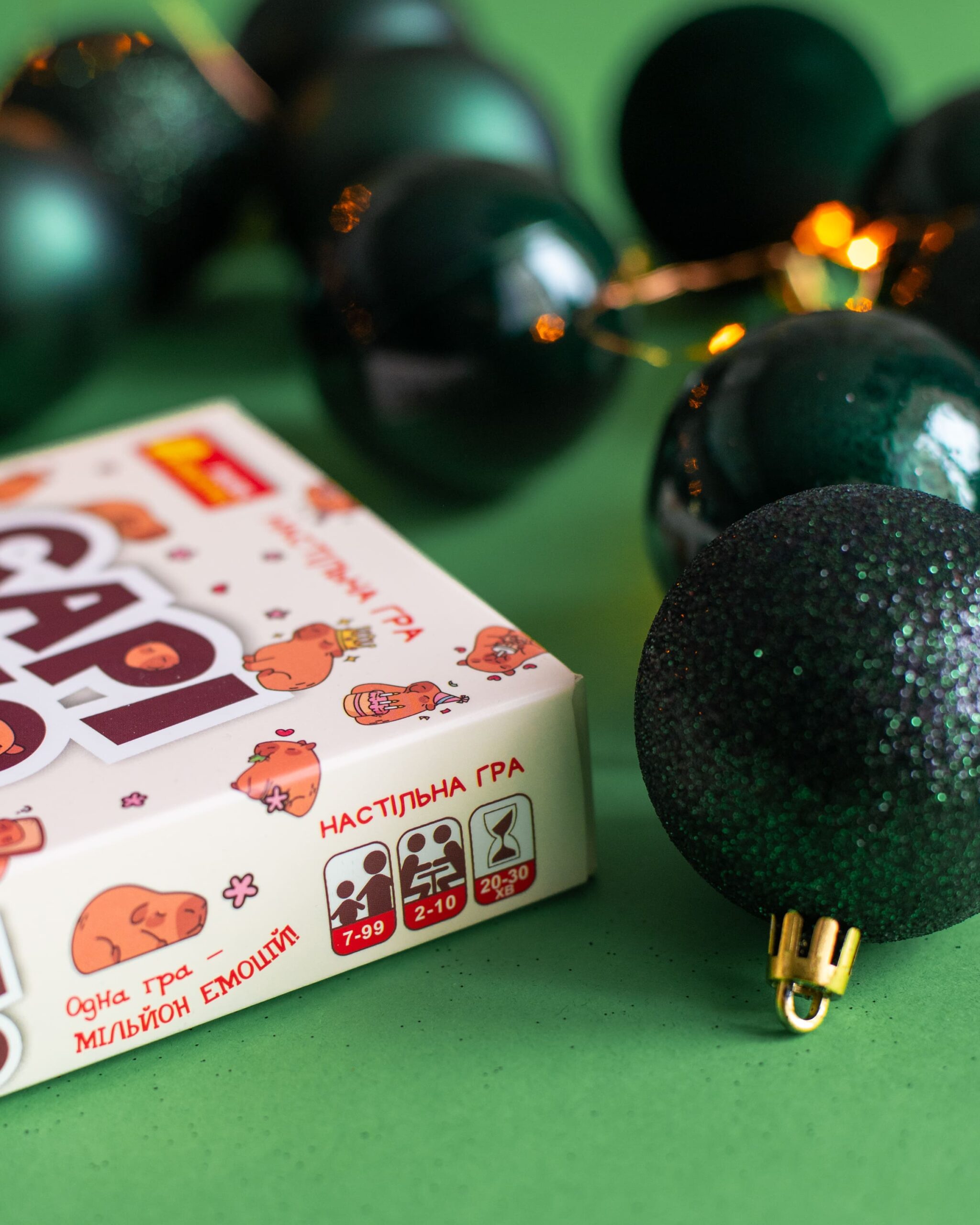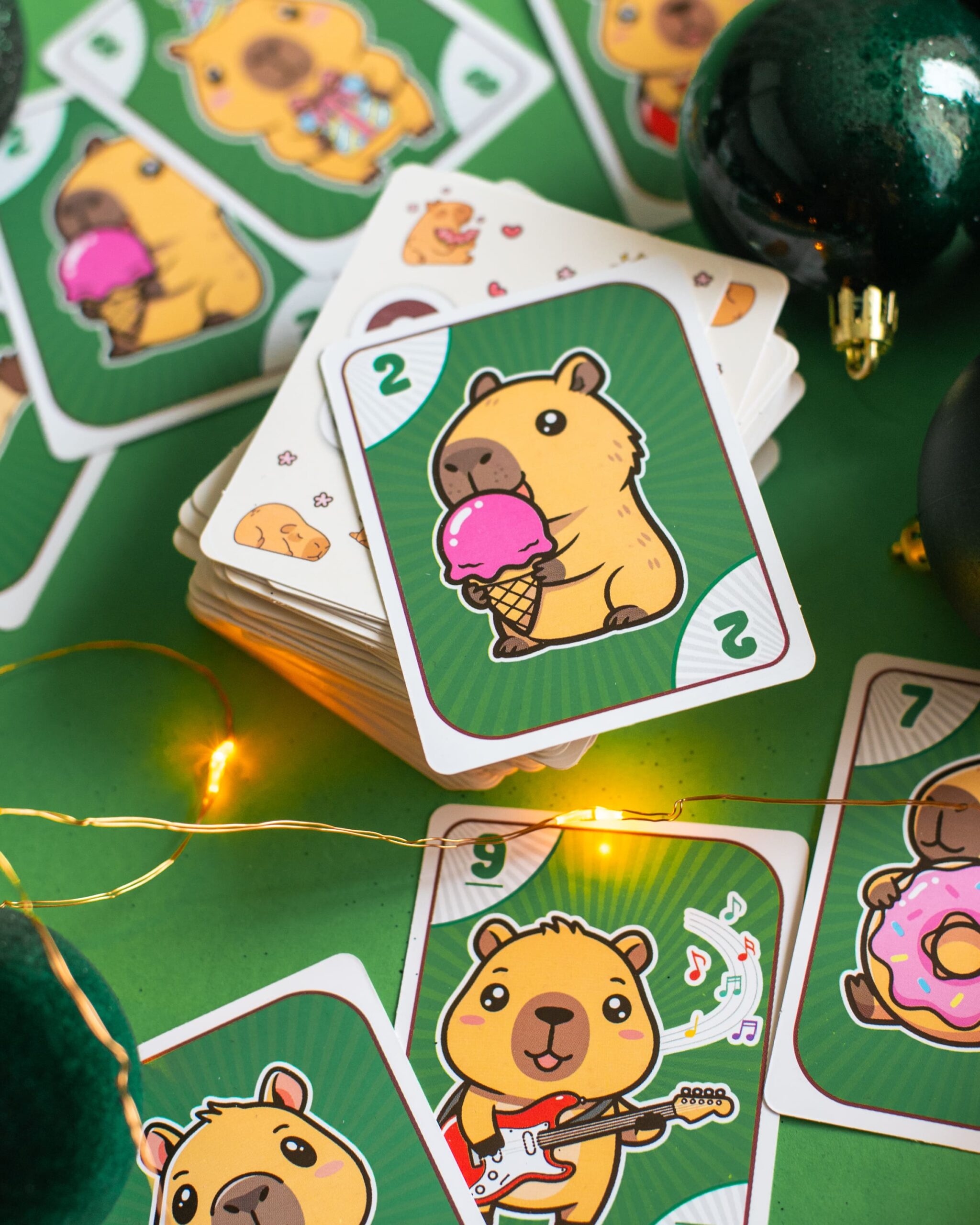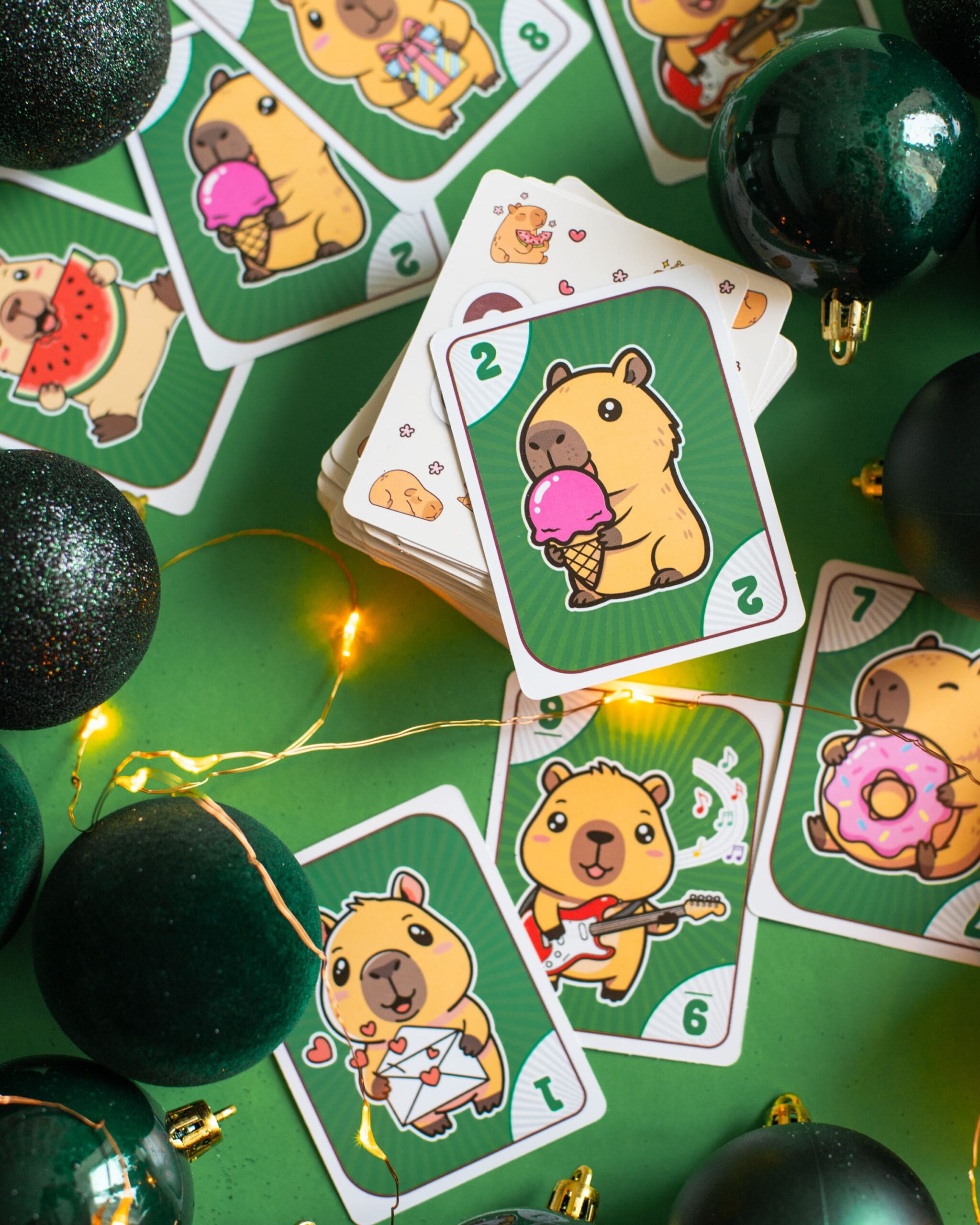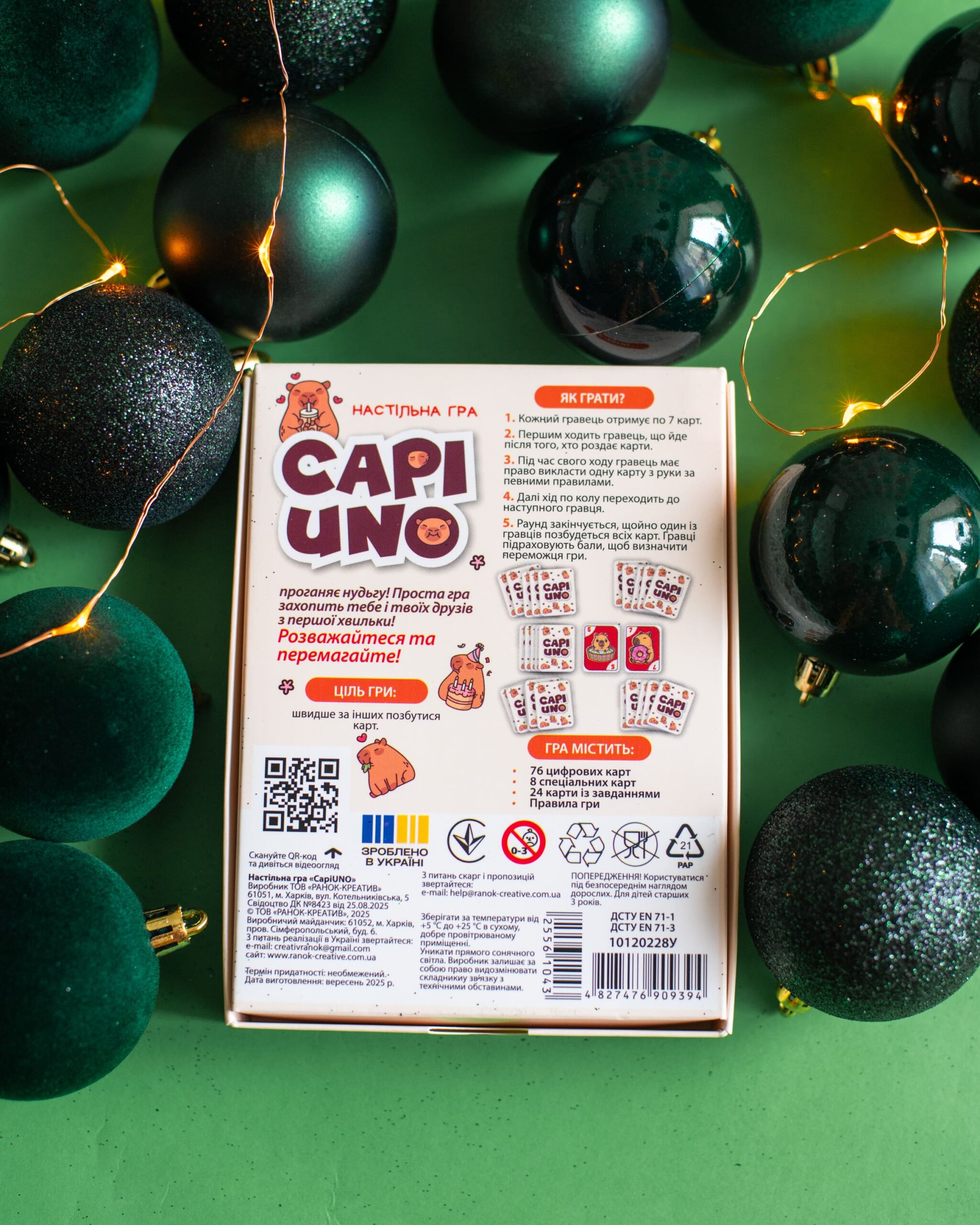 CAPIUNO – КапіУНО дарує мільйон емоцій у компактному форматі! Гра розрахована на 2–10 гравців і триває 20–30 хвилин, але азарту вистачить на весь вечір. Завдання просте — першим позбутися карт, а виграти можна у двох варіантах підрахунку очок. Родзинка гри — картки із зображеннями милих та популярних капібар, які вже стали зірками соцмереж. У наборі: 76 цифрових, 8 спеціальних, 24 карти із завданнями та правила.