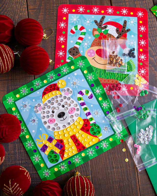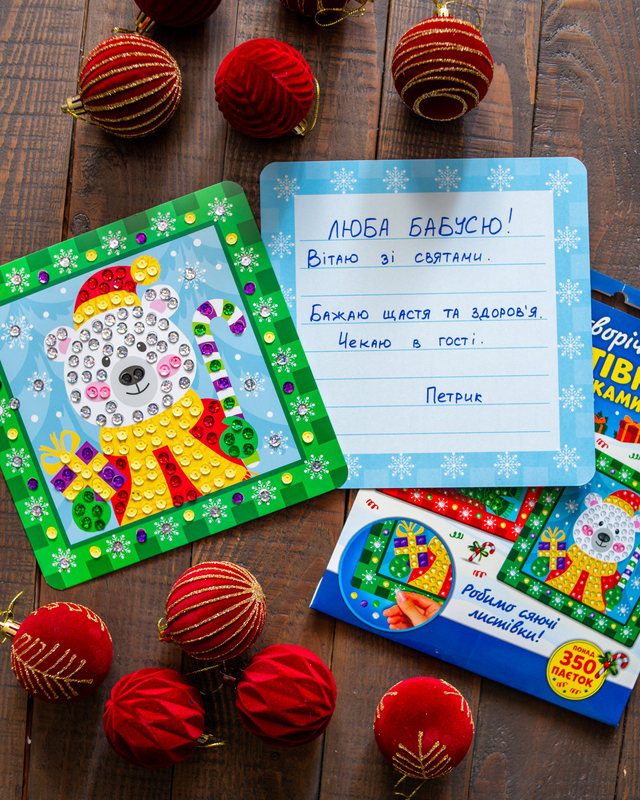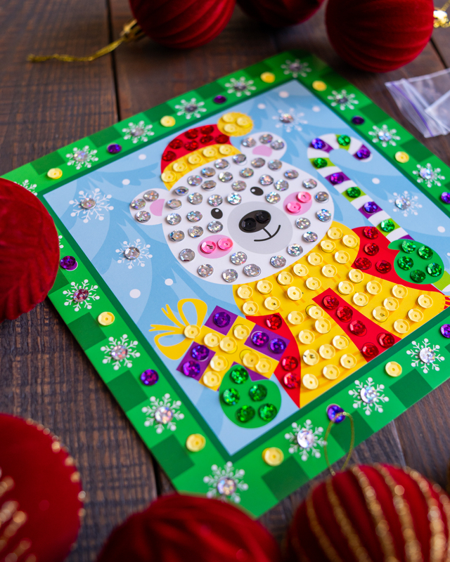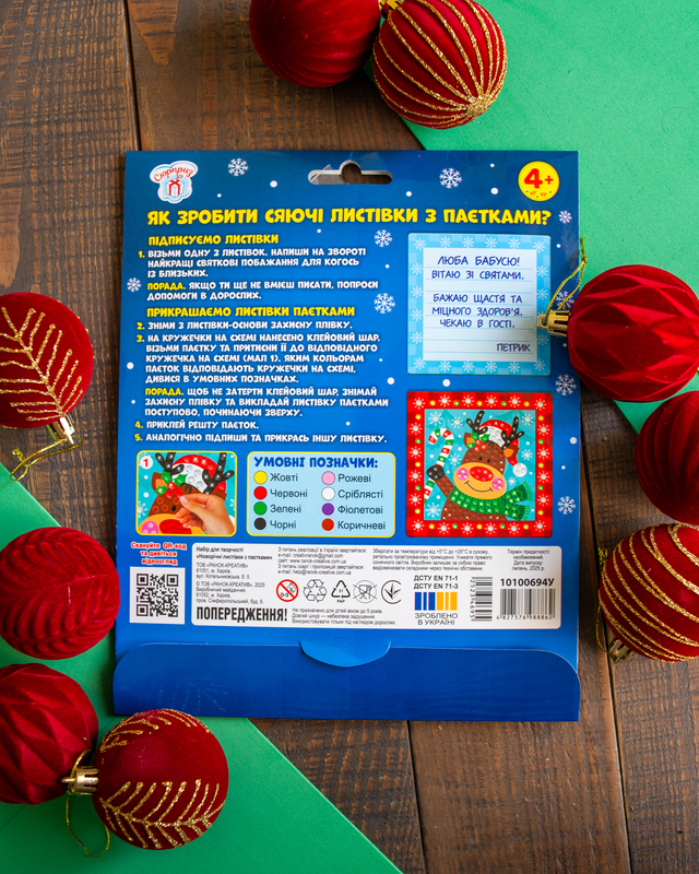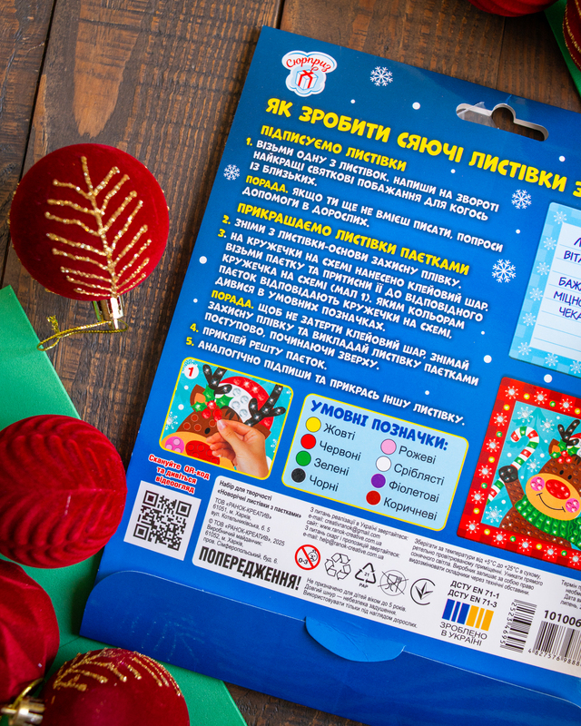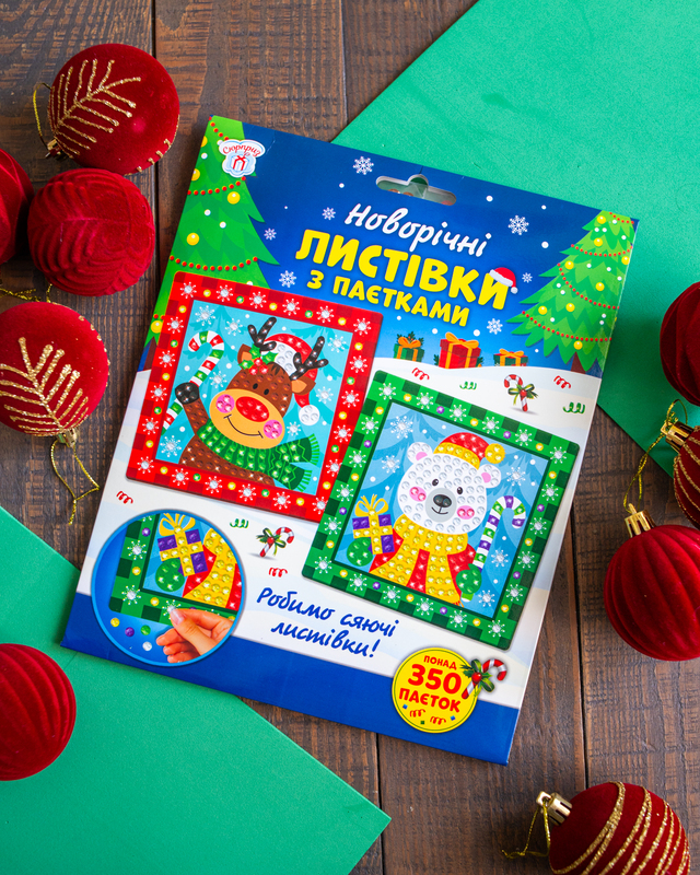 У комплекті – 2 яскраві листівки та понад 350 блискучих паєток для неповторного декору. Завдяки простій інструкції з позначками процес стане цікавим та легким навіть для дітей від 4 років. Набір допомагає розвивати дрібну моторику, фантазію та творчість, а створені власноруч листівки можна підписати теплими побажаннями і подарувати рідним. Зручне пакування у форматі А4-конверту ідеально підходить для дому, садочка чи мандрівок, а сяючі листівки принесуть святковий настрій