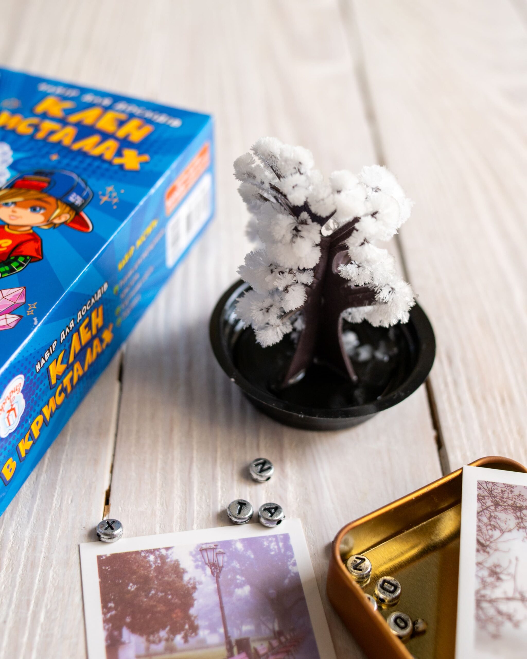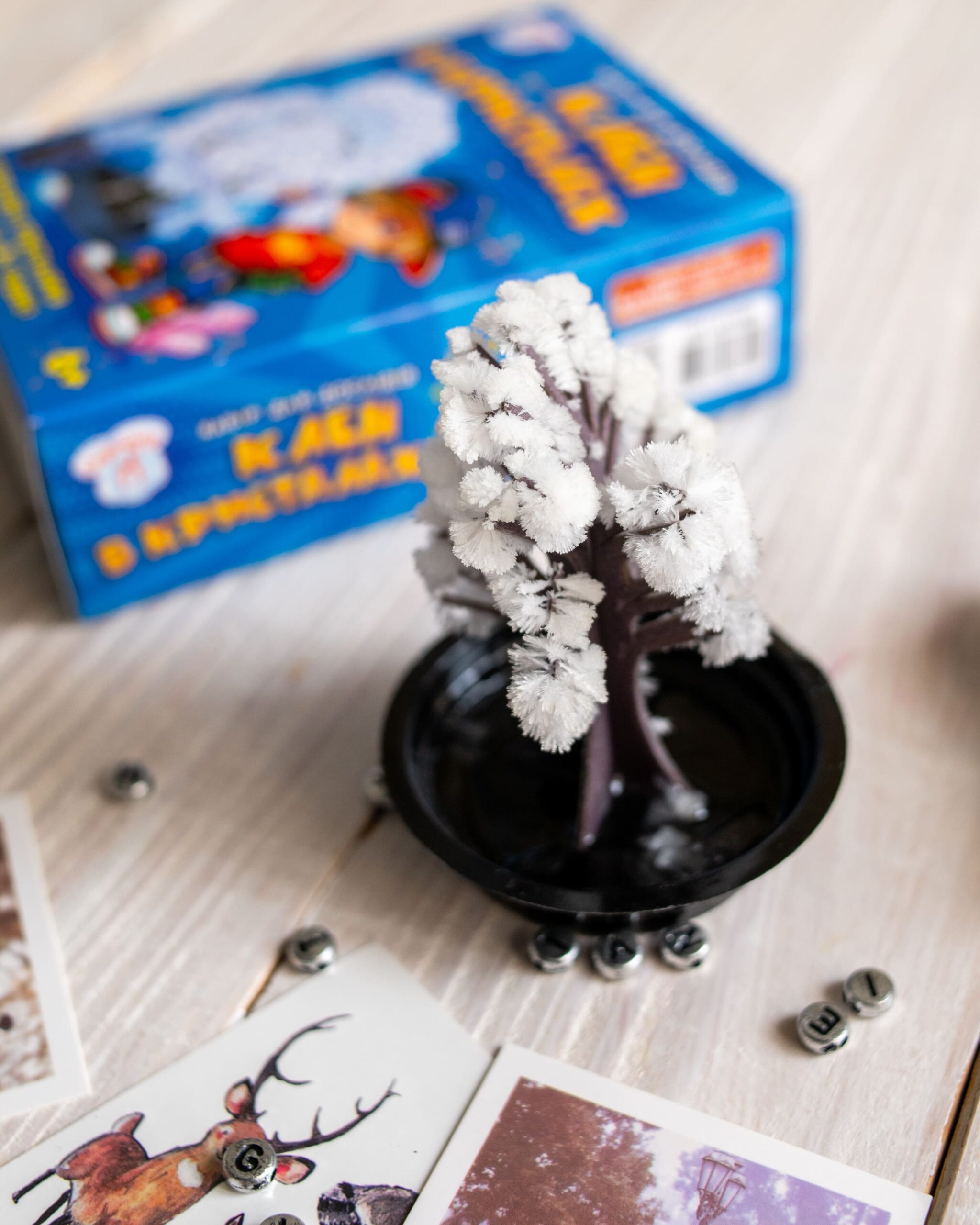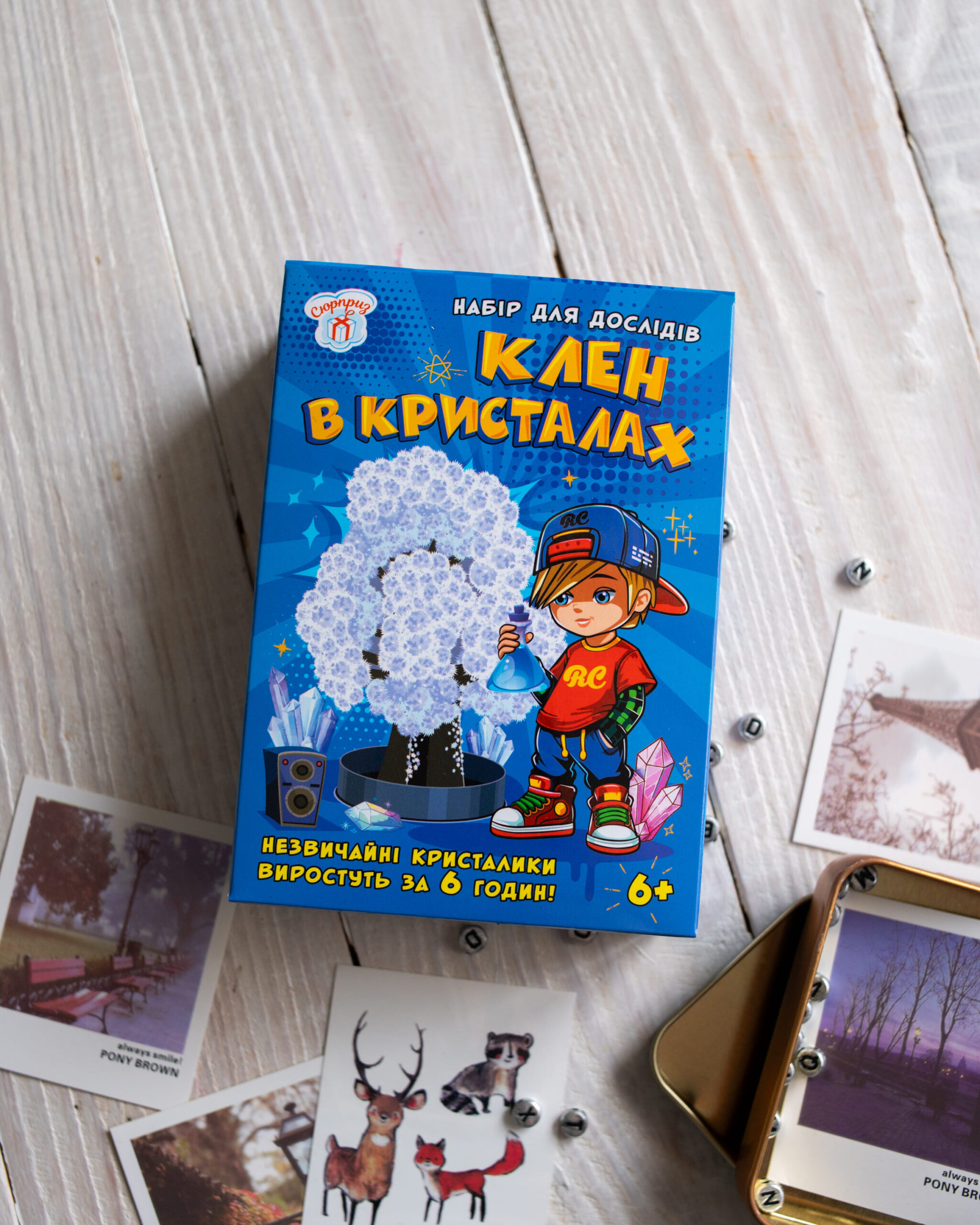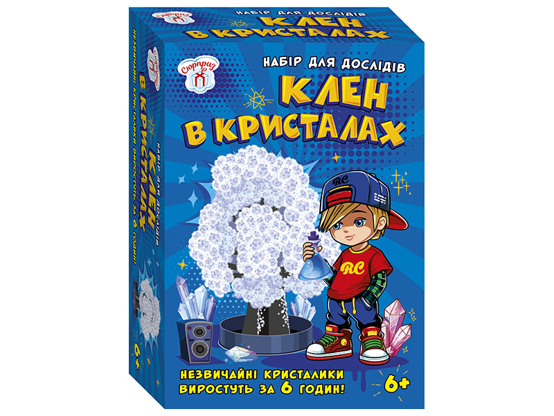 Створюйте маленьке диво просто вдома! Картонний клен оживає на очах: його гілочки вкриваються сяючими білими кристалами, що переливаються на світлі. Збираєте каркас, ставите дерево в підставку, заливаєте розчин __ і магія починається! Цей захопливий дослід розвиває допитливість, уважність і любов до науки, дарує яскраві емоції та неймовірне захоплення дітям від 6 років.