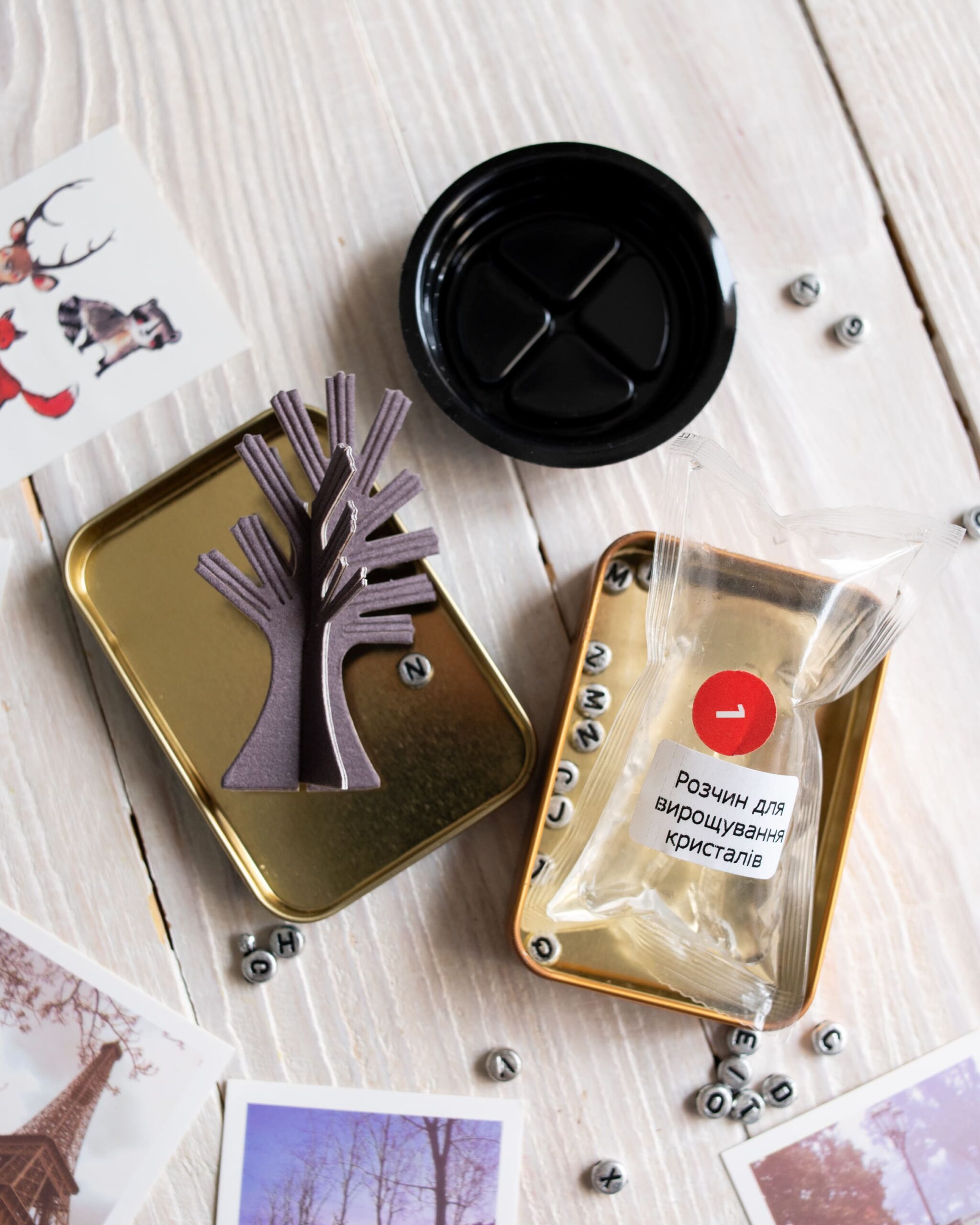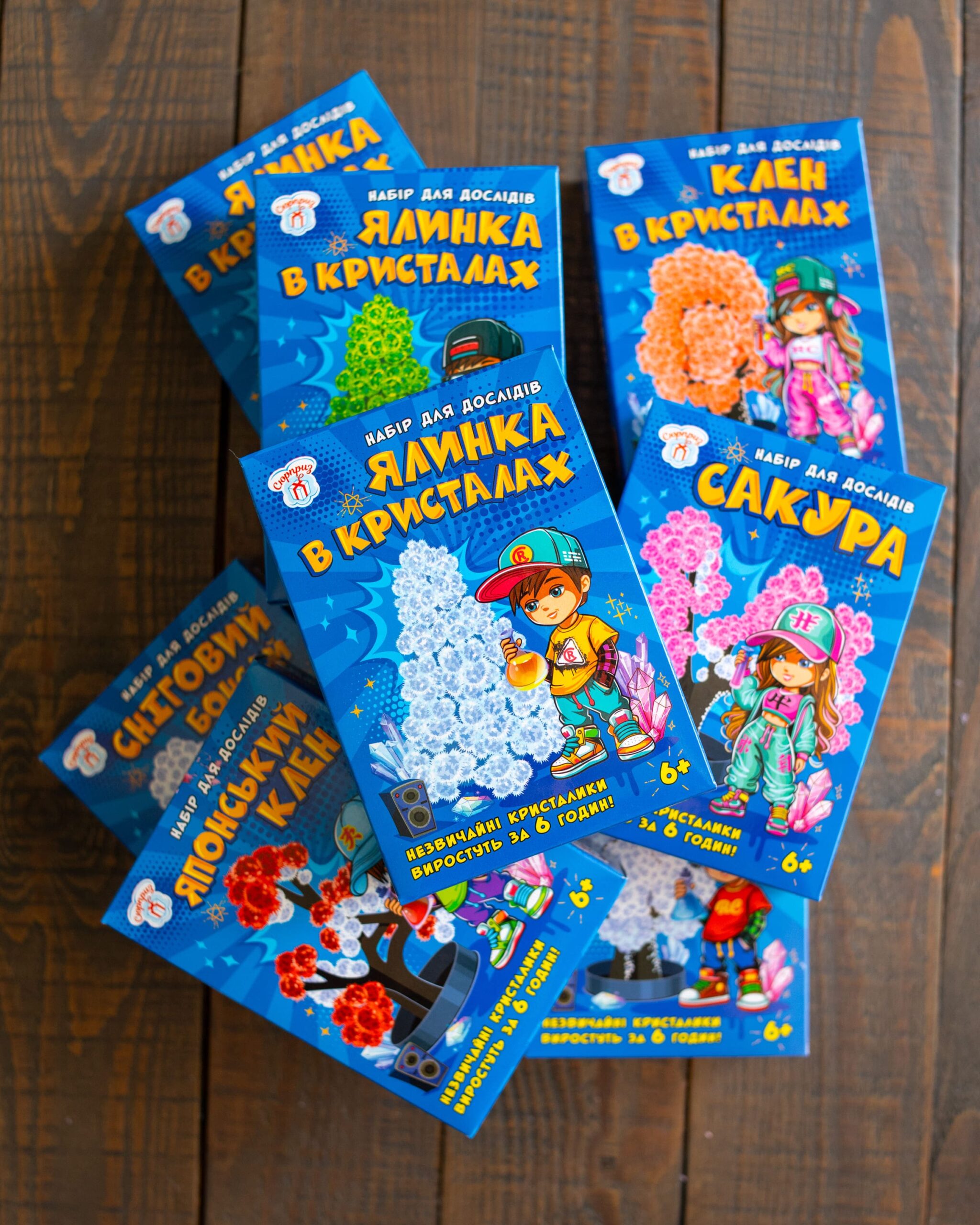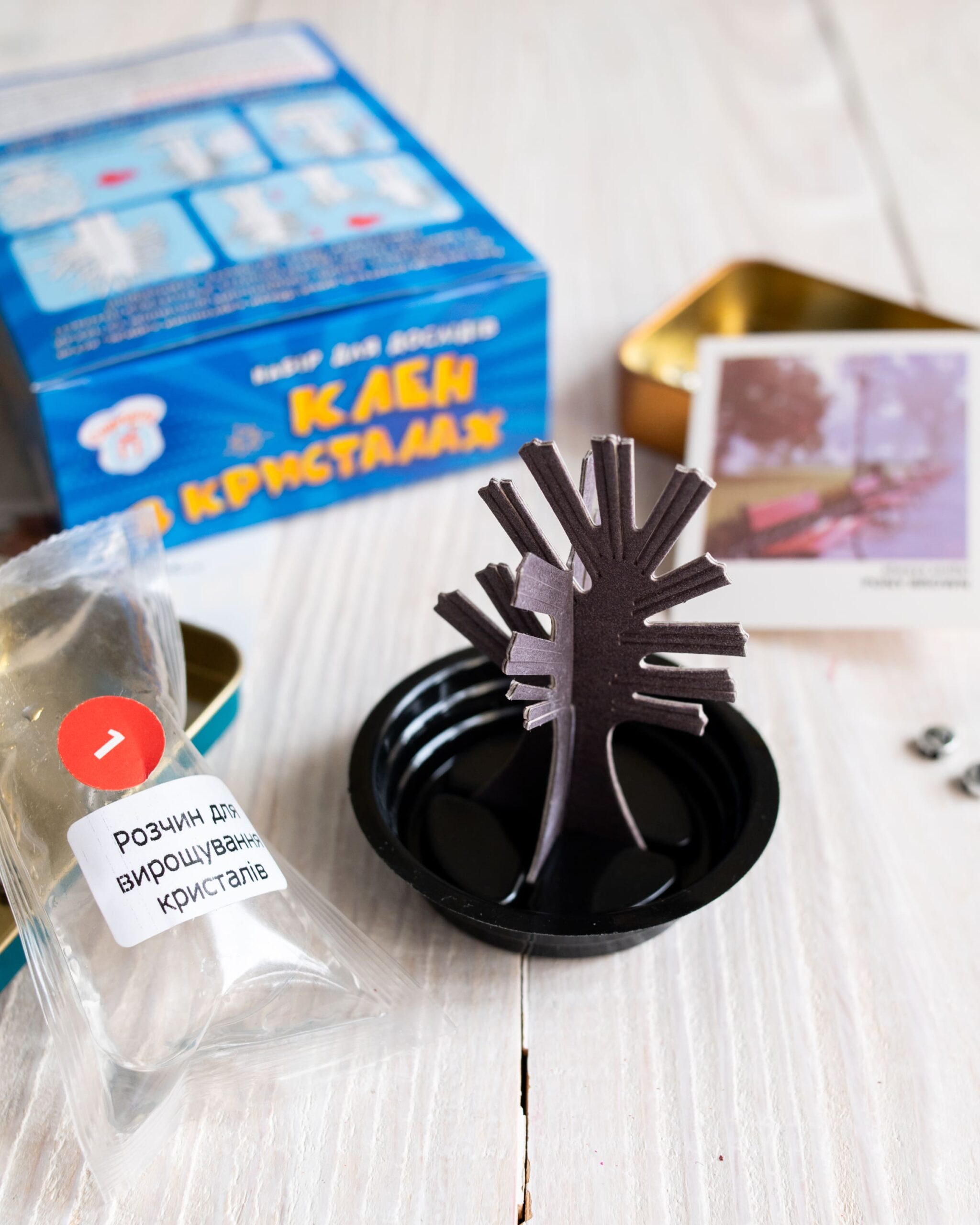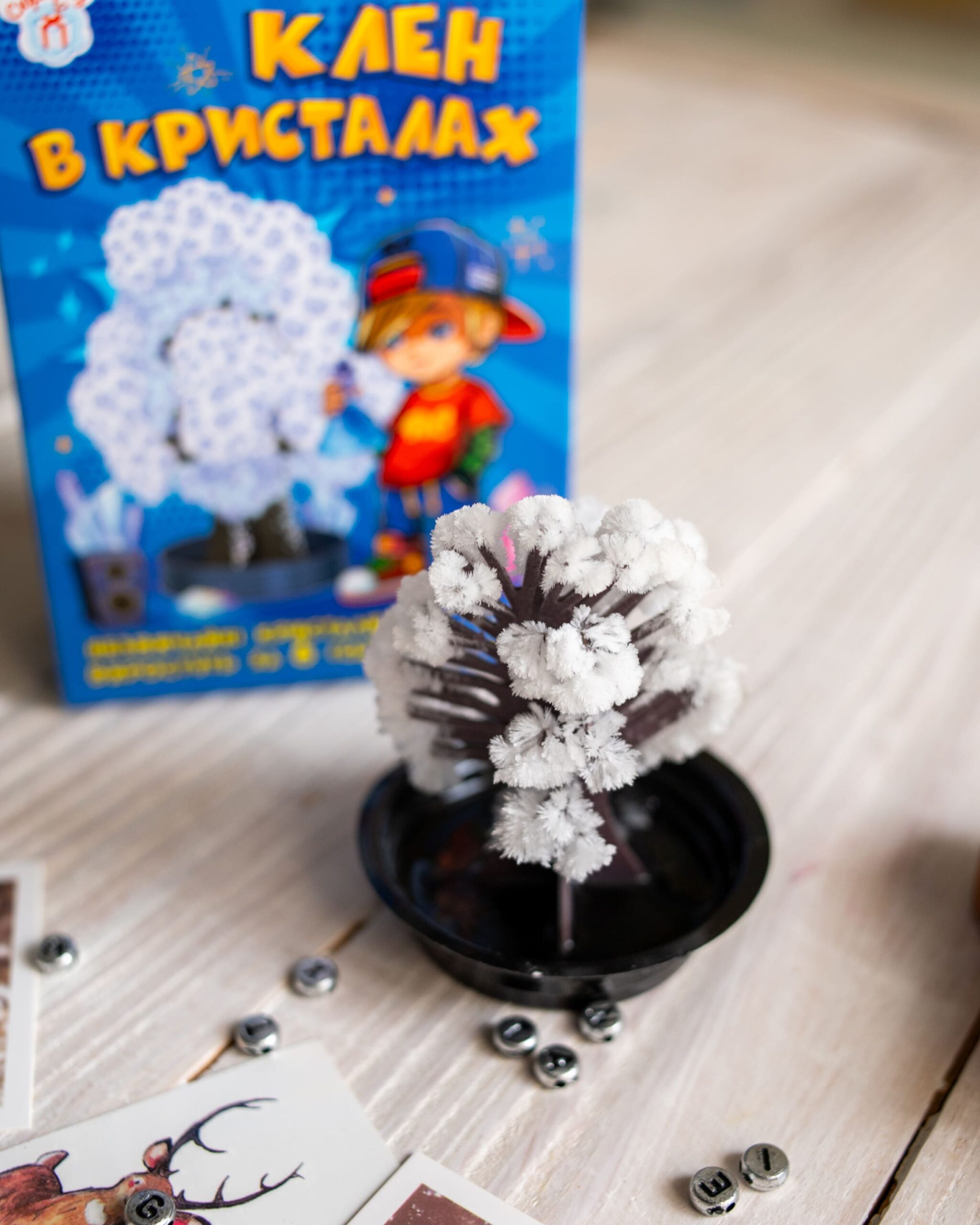 Створюйте маленьке диво просто вдома! Картонний клен оживає на очах: його гілочки вкриваються сяючими білими кристалами, що переливаються на світлі. Збираєте каркас, ставите дерево в підставку, заливаєте розчин __ і магія починається! Цей захопливий дослід розвиває допитливість, уважність і любов до науки, дарує яскраві емоції та неймовірне захоплення дітям від 6 років.