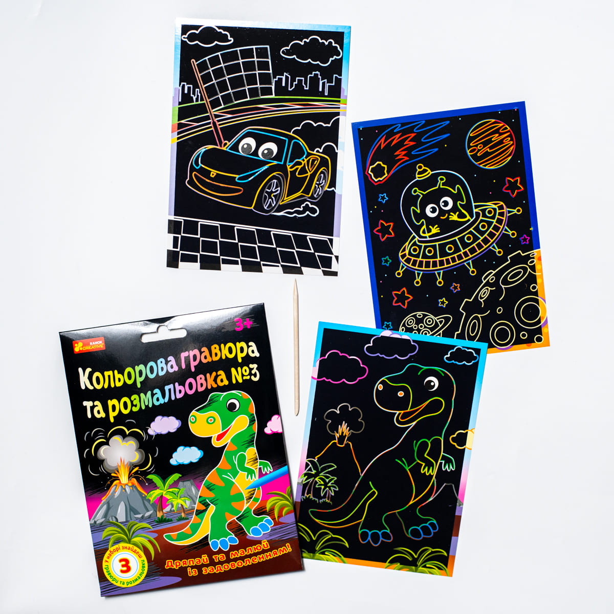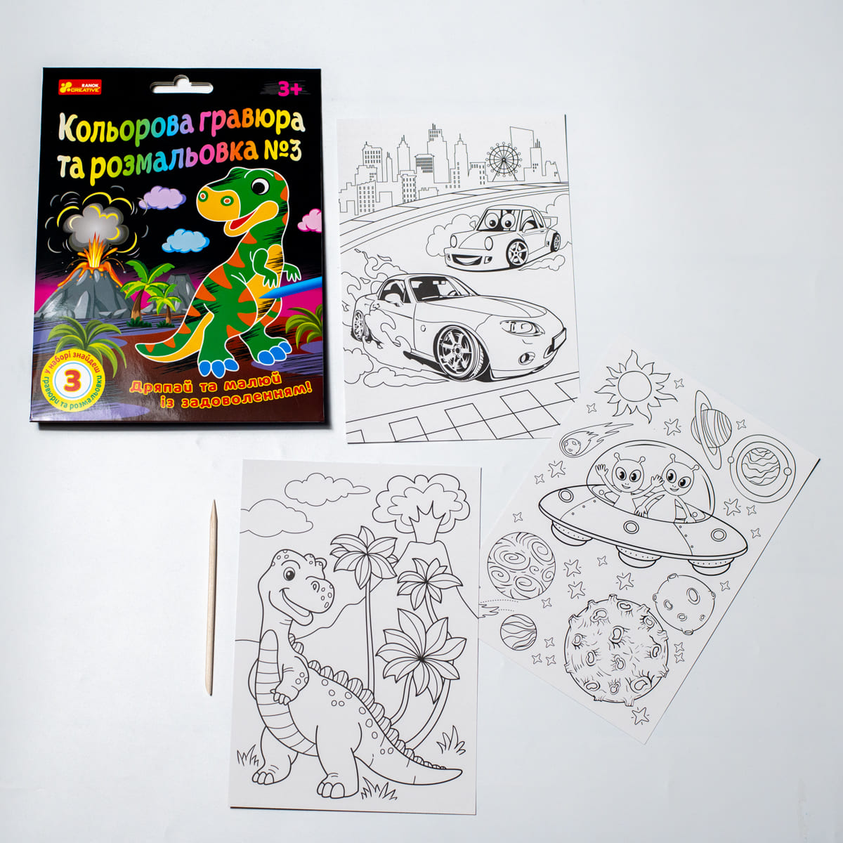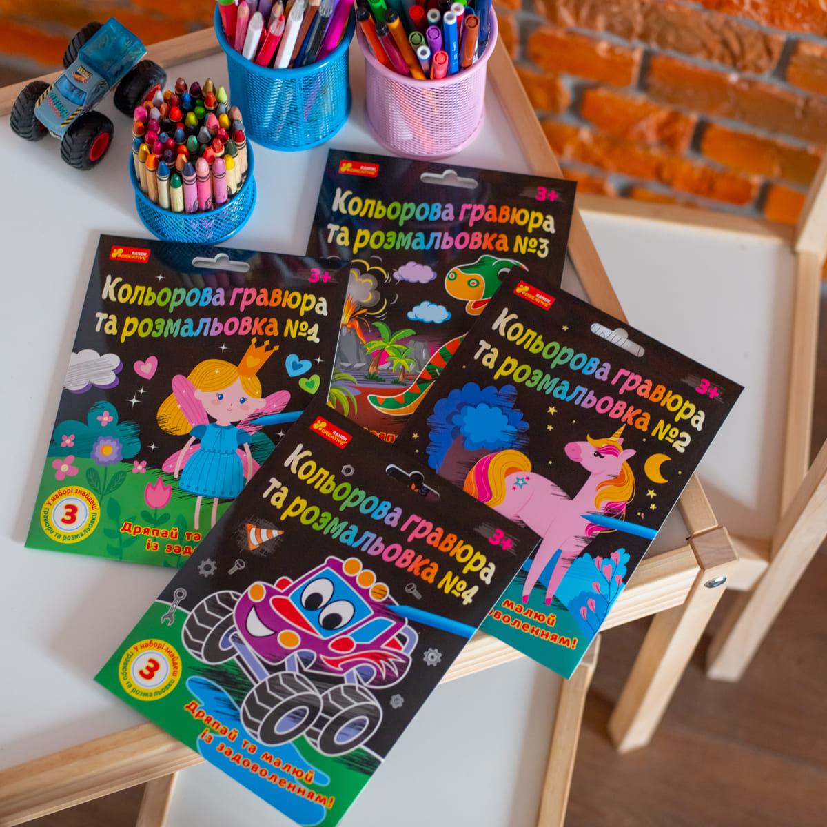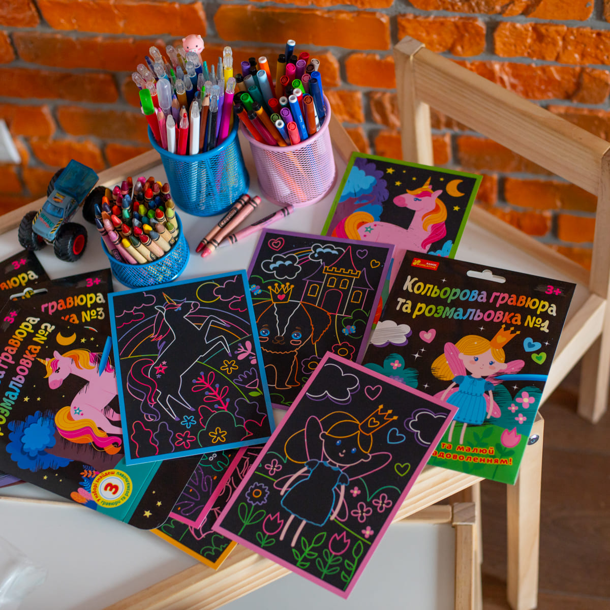 Кольорова гравюра та розмальовка – це неймовірно захоплюючий набір для творчості та розвитку у дітей графомоторних навичок, фантазії та посидючості.