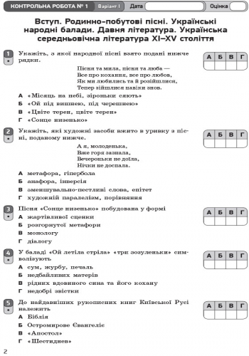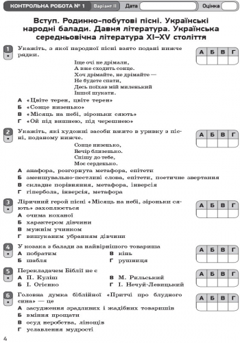 Зошит складається з двох частин: завдання для контрольних робіт з української літератури, складені відповідно до «Критеріїв оцінювання навчальних досягнень
