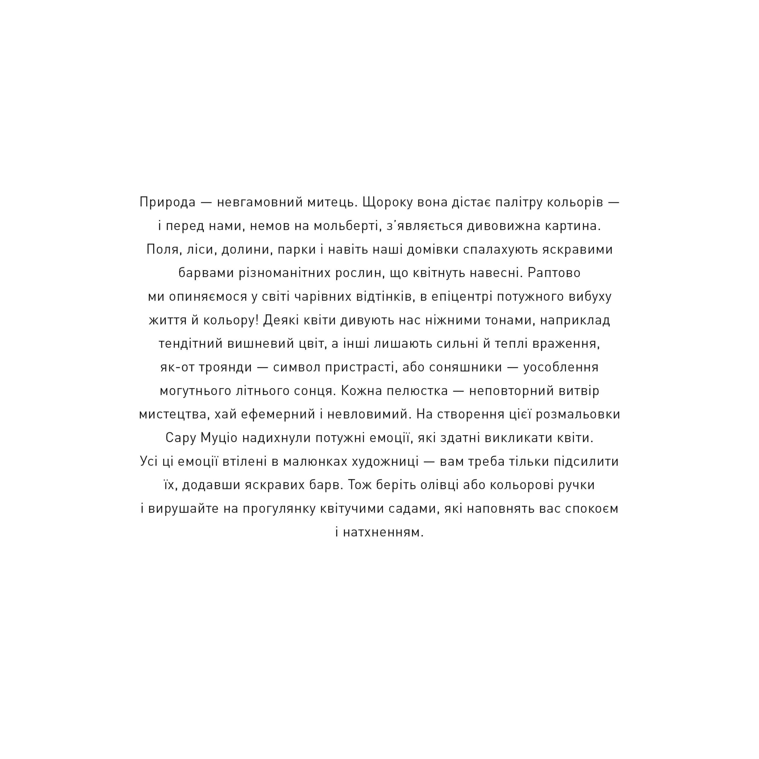 Ніжні, як вишневий цвіт, пристрасні, як червона троянда, або яскраві та незламні, як соняшники, — квіти здатні дарувати нам особливі емоції. Художниця Сара Муціо майстерно втілила ці емоції у своїх деталізованих ілюстраціях для розмальовки «Квітучі сади». Сторінка за сторінкою, квітка за квіткою наповніть їх різноманітними кольорами та відтінками. Опинившись у цьому барвистому вихорі, ви неодмінно відчуєте енергію, яка надихатиме вас на творчість.