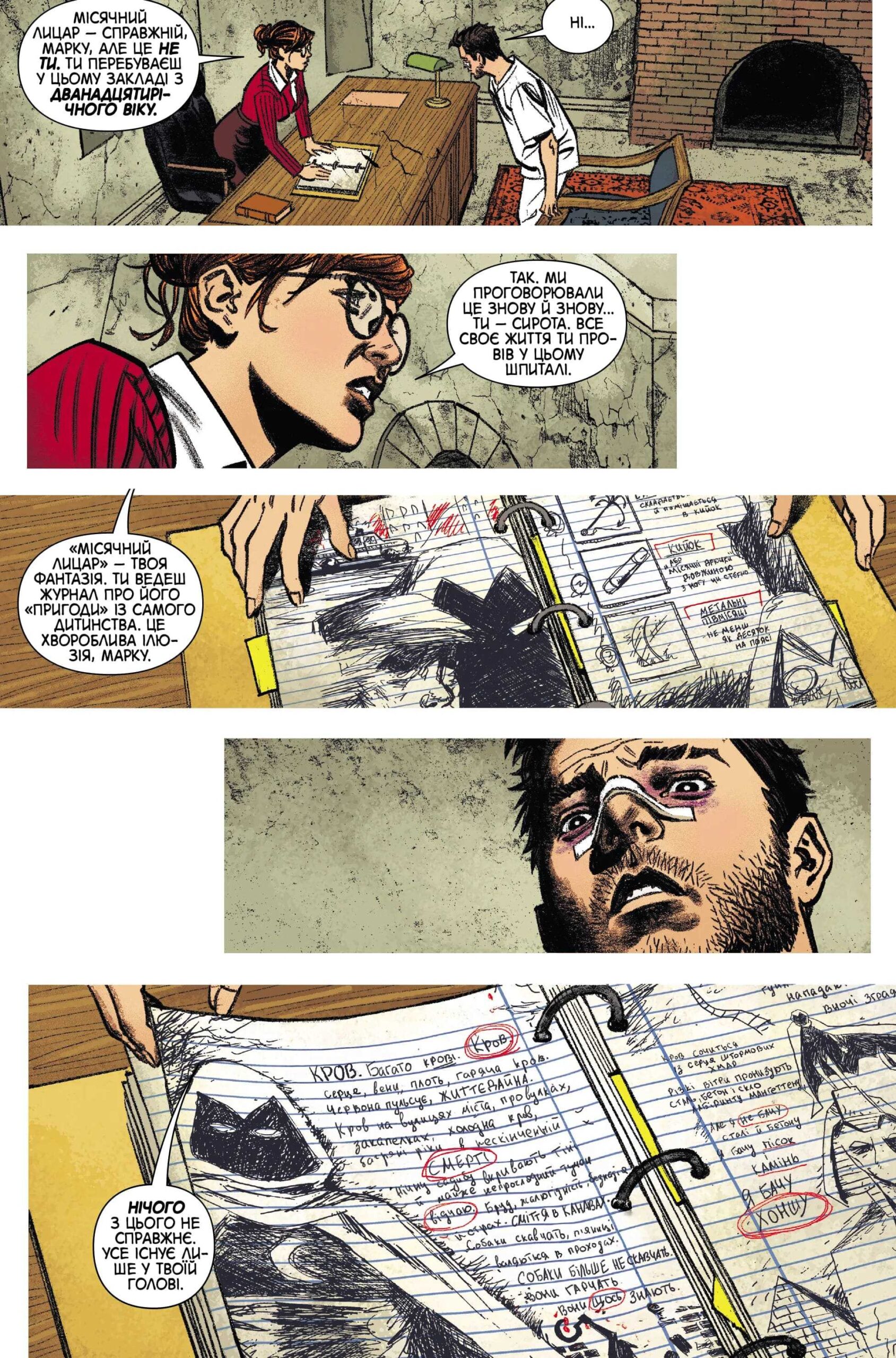 Коли Марк прокидається в психлікарні – його оточують бундючна лікарка, вороже налаштовані санітари, байдужі пацієнти. Але, ймовірно, ці обличчя — лише маски, за ховаються друзі, вороги, боги та монстри! Марку доведеться пробиватися з боєм. Чи врятує Марка цього разу його покровитель? Місяць високо в небі, маска на обличчі – але якщо йому вдасться втекти, чи знайде він місто пісків? І що станеться, коли Марк Спектор зустрінеться з… Місячним Лицарем! Усе, що вам відомо, може виявитися хибним — але не дізнатися правду — божевілля!