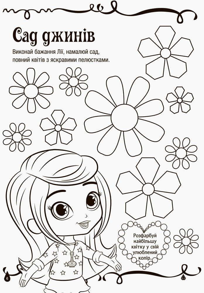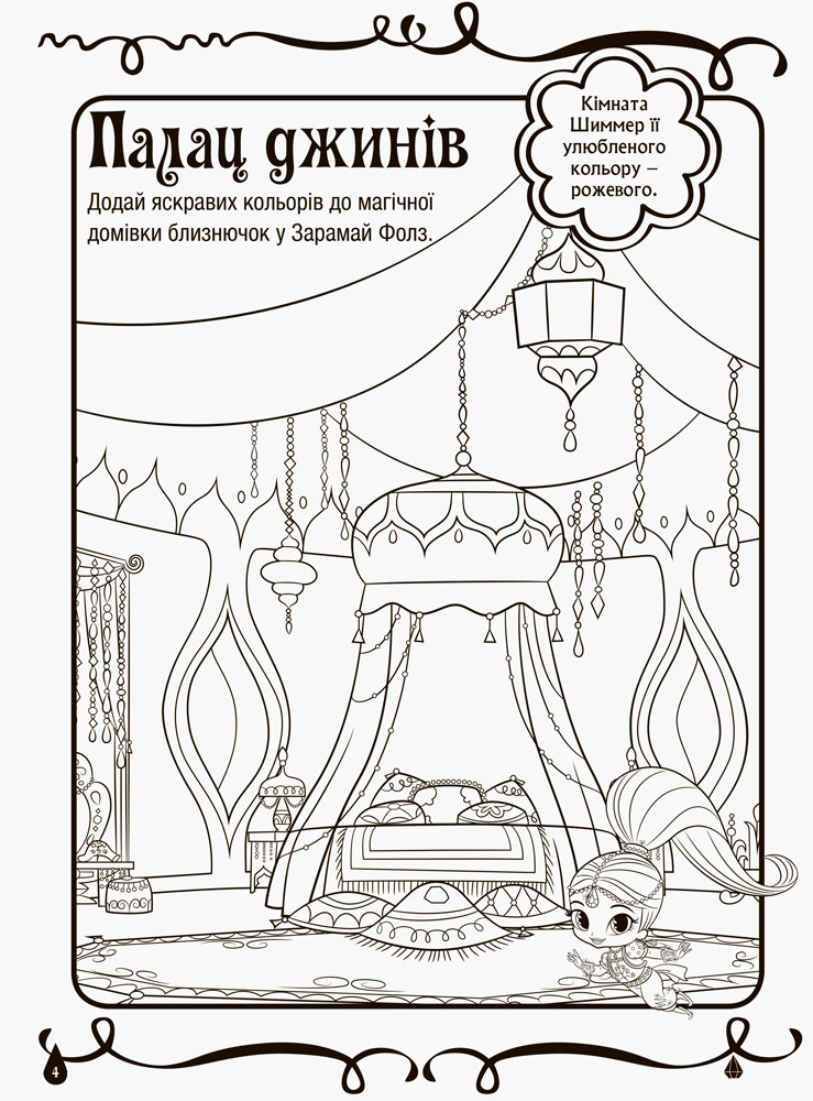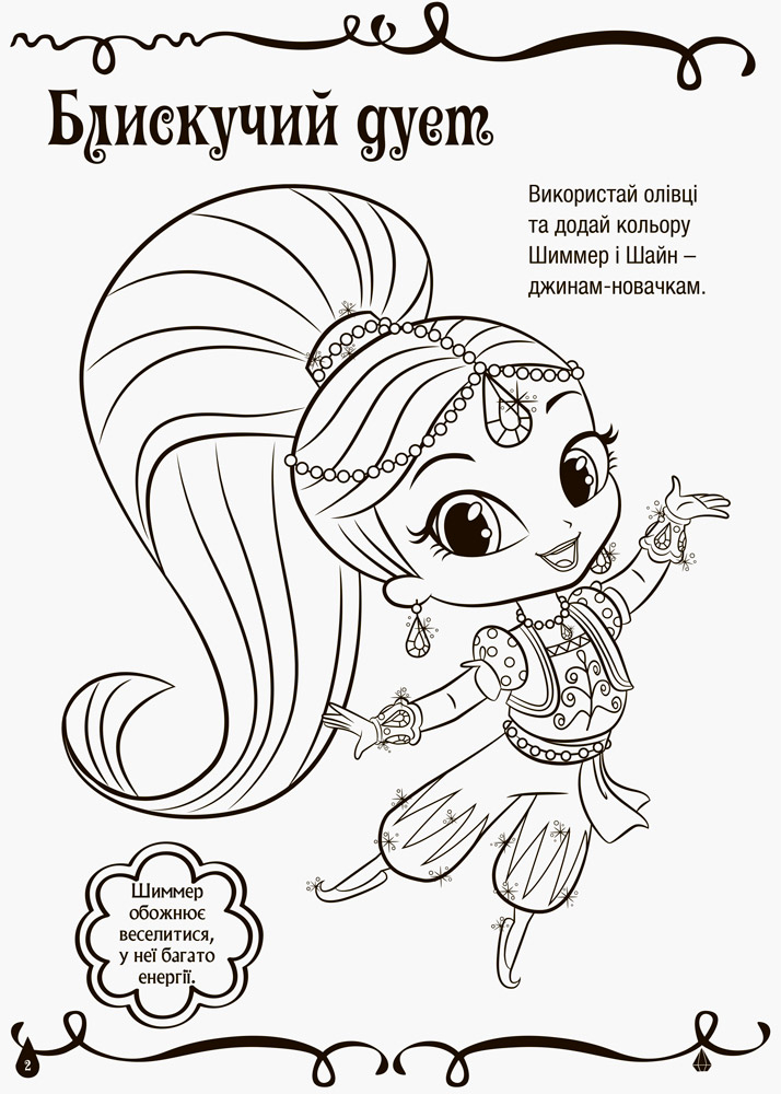 Ти готова приєднатися до джинів-новачків Шиммер і Шайн у їхній кольоровій магічній пригоді? Усередині ти знайдеш безліч малюнків, де бракує яскравих фарб. Швиденько бери кольорові олівці та додай магії на сторінки цієї розмальовки!