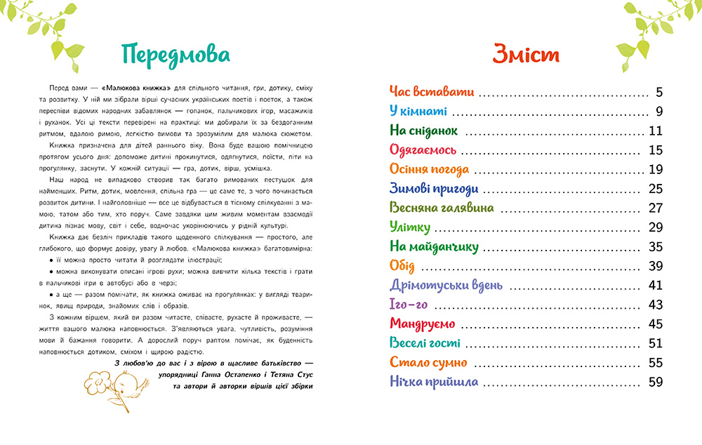 Найголовніша справа малюка – рости і розвиватися, але розвиток не можливий без спілкування з дорослими, розмов, рухів та обіймів. В «Малюковій книжці» ви знайдете все, що допоможе розвитку малечі: веселі, ігрові вірші сучасних поетів, гопанки, забавлянки та потішки; опис вправ, пальчикових ігор, масажів та руханок, які допоможуть вам створити родинні ритуали, що будуть супроводжувати малюка цілий день: під час пробудження та засинання, годування, одягу, прогулянок, ігор.