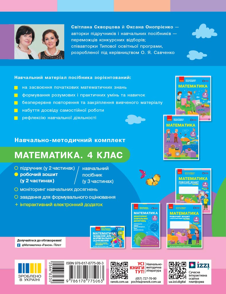 Посібник є складовою навчально-методичного комплекту «Математика. 4 клас» авторів Світлани Скворцової, Оксани Онопрієнко. Зошит створений на основі підручника, доповнює його зміст, що забезпечує якісне досягнення учнями очікуваних результатів навчання.