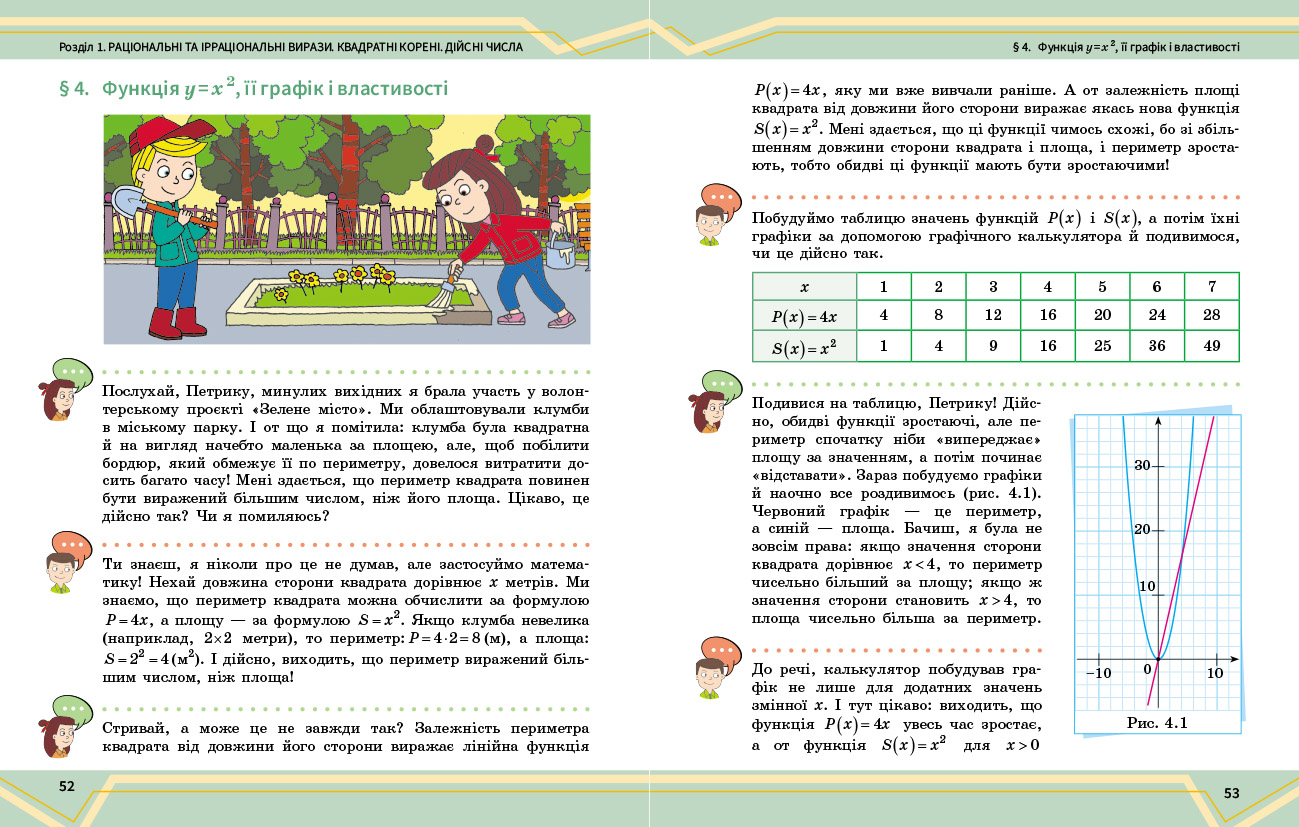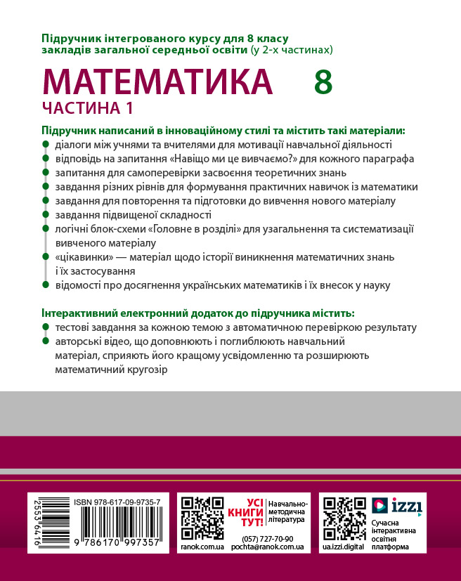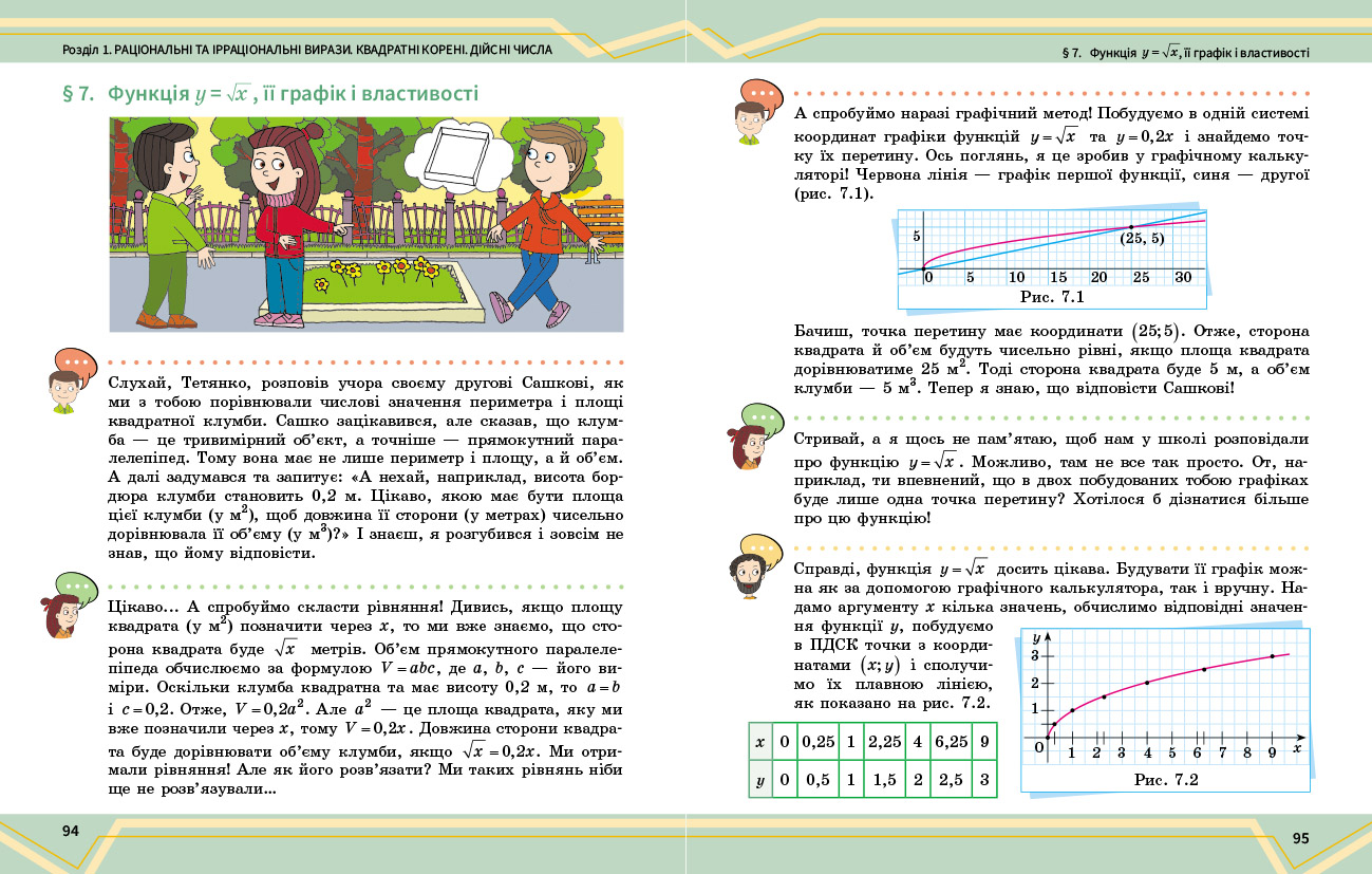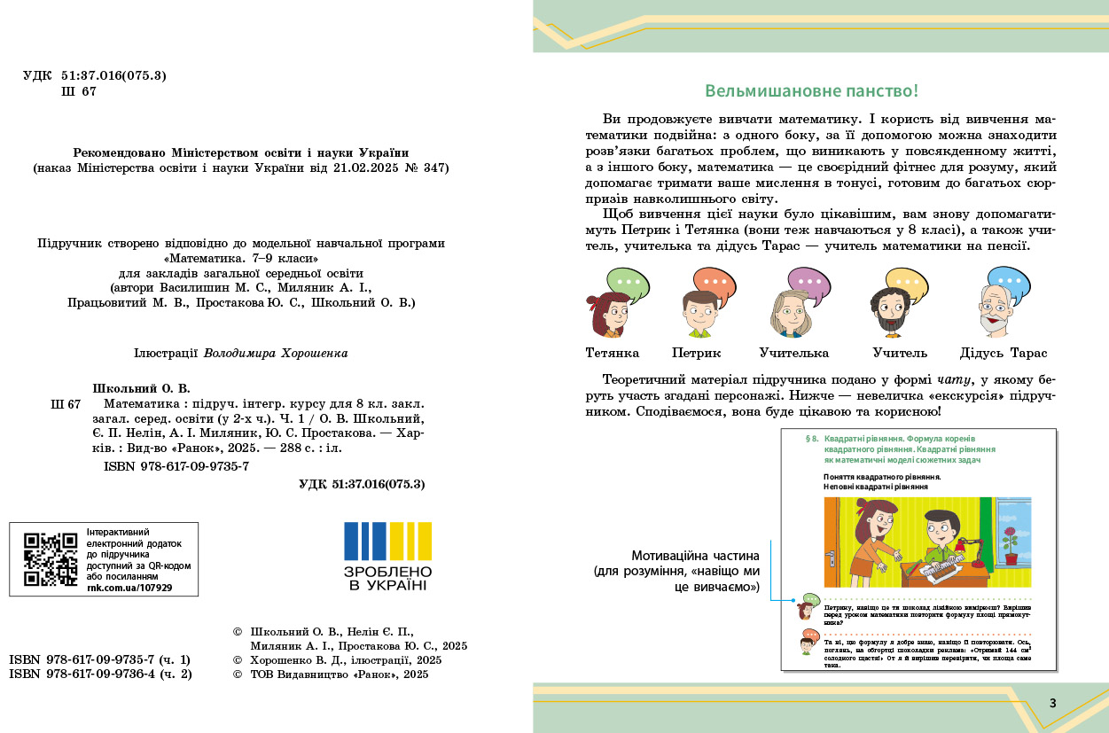Підручник створено відповідно до модельної навчальної програми «Математика. 7–9 класи» для закладів загальної середньої освіти (автори Василишин М. С., Миляник А. І., Працьовитий М. В., Простакова Ю. С., Школьний О. В.). Теоретичний матеріал подано у формі діалогу між учнями та вчителями; практичний матеріал (рубрика «Тренажерний зал») структуровано за рівнями навчальних досягнень учнів.