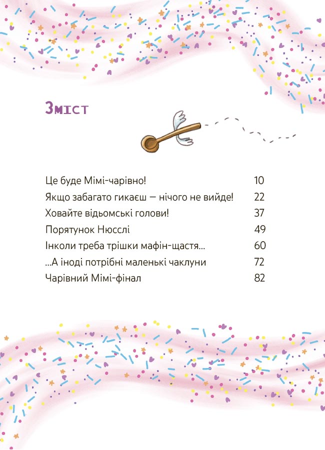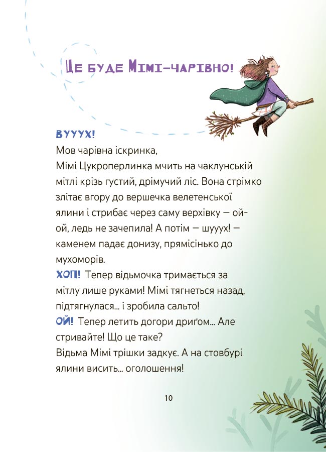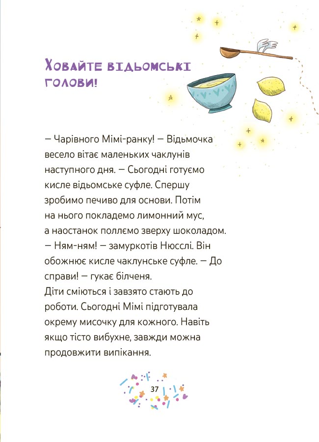 Запрошуємо маленьких читачів до світу магії та чарівництва — у смачний і дивовижний світ, де мафіни вміють літати, а поцілунки мають присмак лимону! Школа для відьом шукає нову пекарку, і Мімі Цукроперлинка — незвичайна кулінарка, яка виграла кухарський конкурс у Гренландії, — вирішує спробувати свої сили. Та на неї чекає не лише пробний урок, а й суперництво з відьмою Фурункель.
