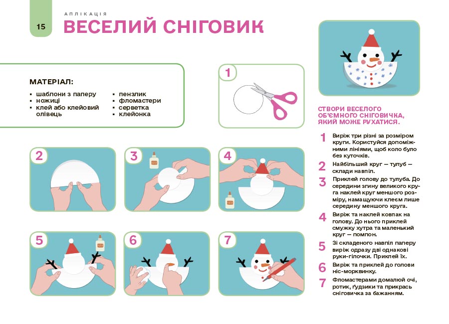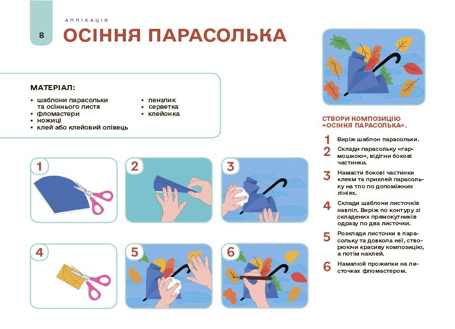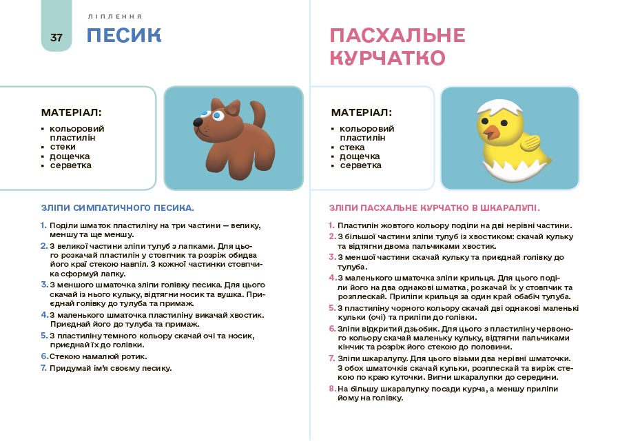 Альбом містить 14 занять з аплікації та 13 занять з ліплення; матеріали з покроковими інструкціями; шаблони для вирізання та наклеювання; аркуші-основи з відповідним фоном та допоміжними лініями. Відповідно до програми розвитку дітей 5–6 років дібрано теми для аплікації та ліплення згідно з віковими можливостями дітей.