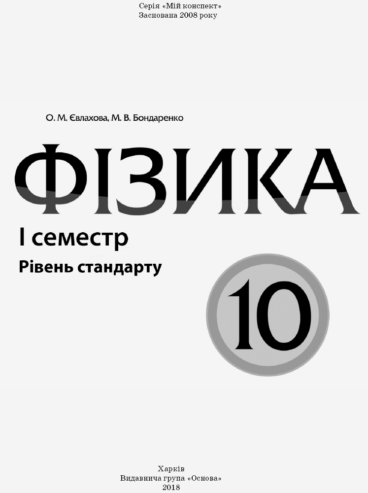 Посібник «Фізика. 10 клас. I семестр.» (серія «Мій конспект») складено за програмою «Фізика і астрономія. Навчальна програма для загальноосвітніх навчальних закладів (рівень стандарту)» авторського колективу під керівництвом О. І. Ляшенка, що затверджена Міністерством освіти і науки України (наказ № 1539 від 24.11. 2017 р.).