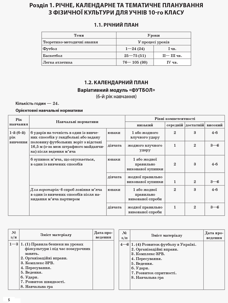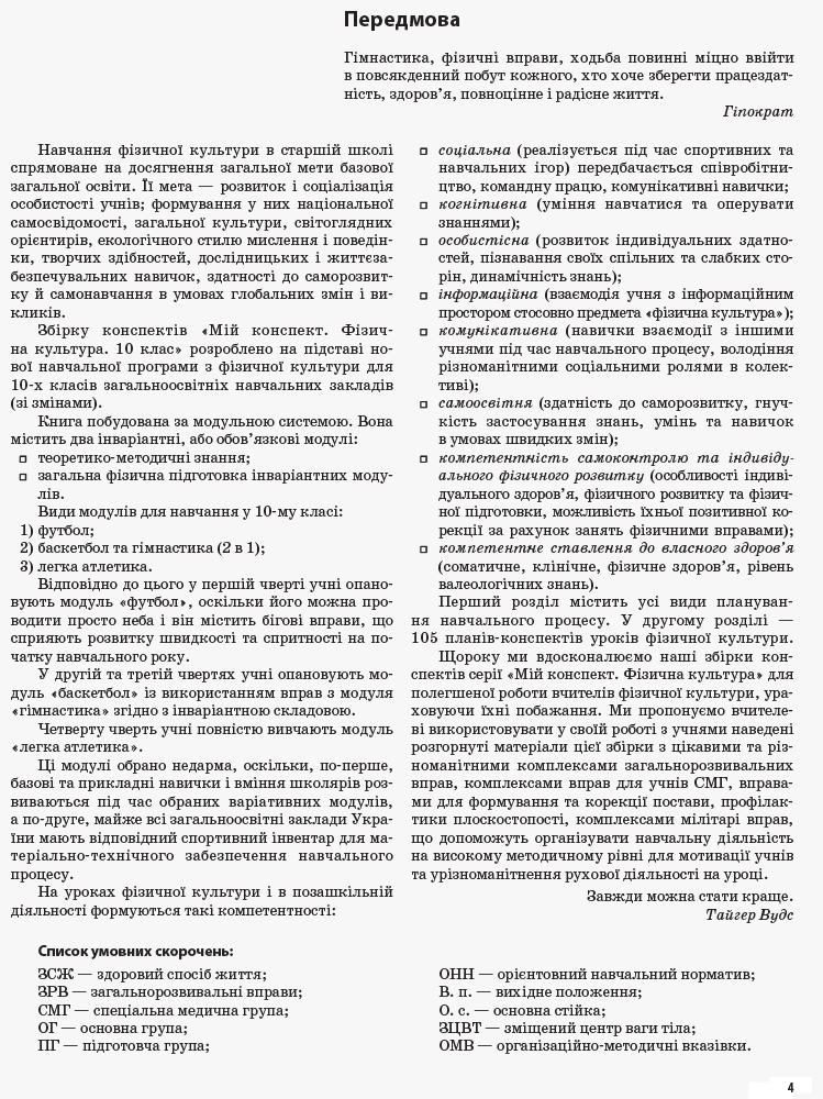 Посібник складено за Новою програмою (2017 р.) зі змінами Міністерства освіти і науки України для використання у загальноосвітньому процесі. Наведені орієнтовний план-графік проходження навчального матеріалу на рік та календарне (тематичне) планування й 105 планів-конспектів уроків з фізичної культури у зручній табличній формі для 10-го класу допоможуть учителеві підготуватися до уроку (доповнюючи або змінюючи запропонований матеріал) і провести його на найвищому методичному рівні. Учителеві м