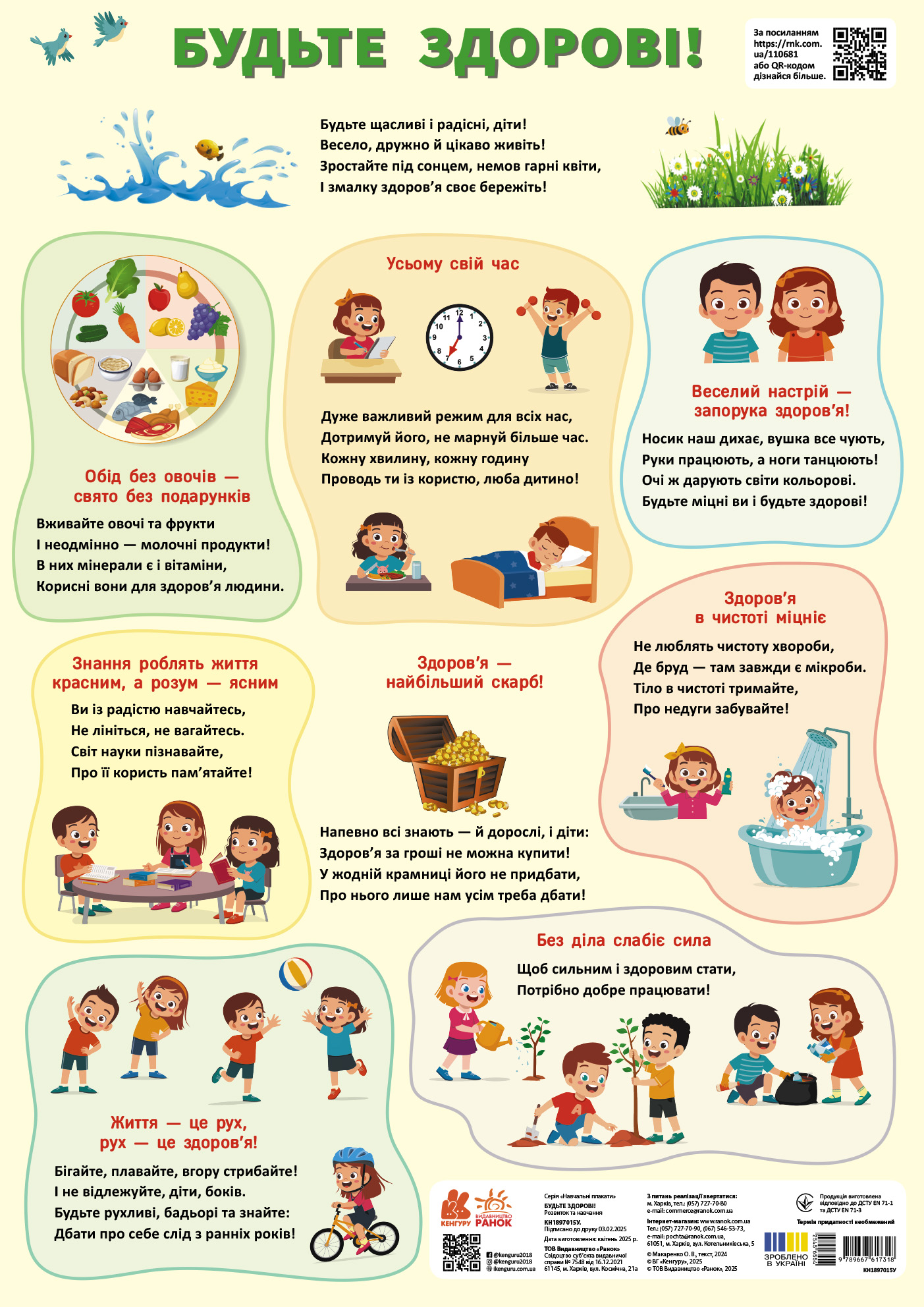 Навчальний плакат «Будьте здорові!» з яскравими ілюстраціями та віршованими рядками надасть можливість навчити дошкільнят здорового способу життя, а саме: як дотримувати режим та гігієну, як правильно харчуватися. Вони дізнаються, яка користь від фізичної активності та позитивного настрою. Плакат сприяє збагаченню знань, прищеплює навички виконання доручень дорослих тощо, а наочність сприяє кращому запам’ятовуванню матеріалу. Більше цікавої пізнавальної інформації можна отримати завдяки QR-коду.