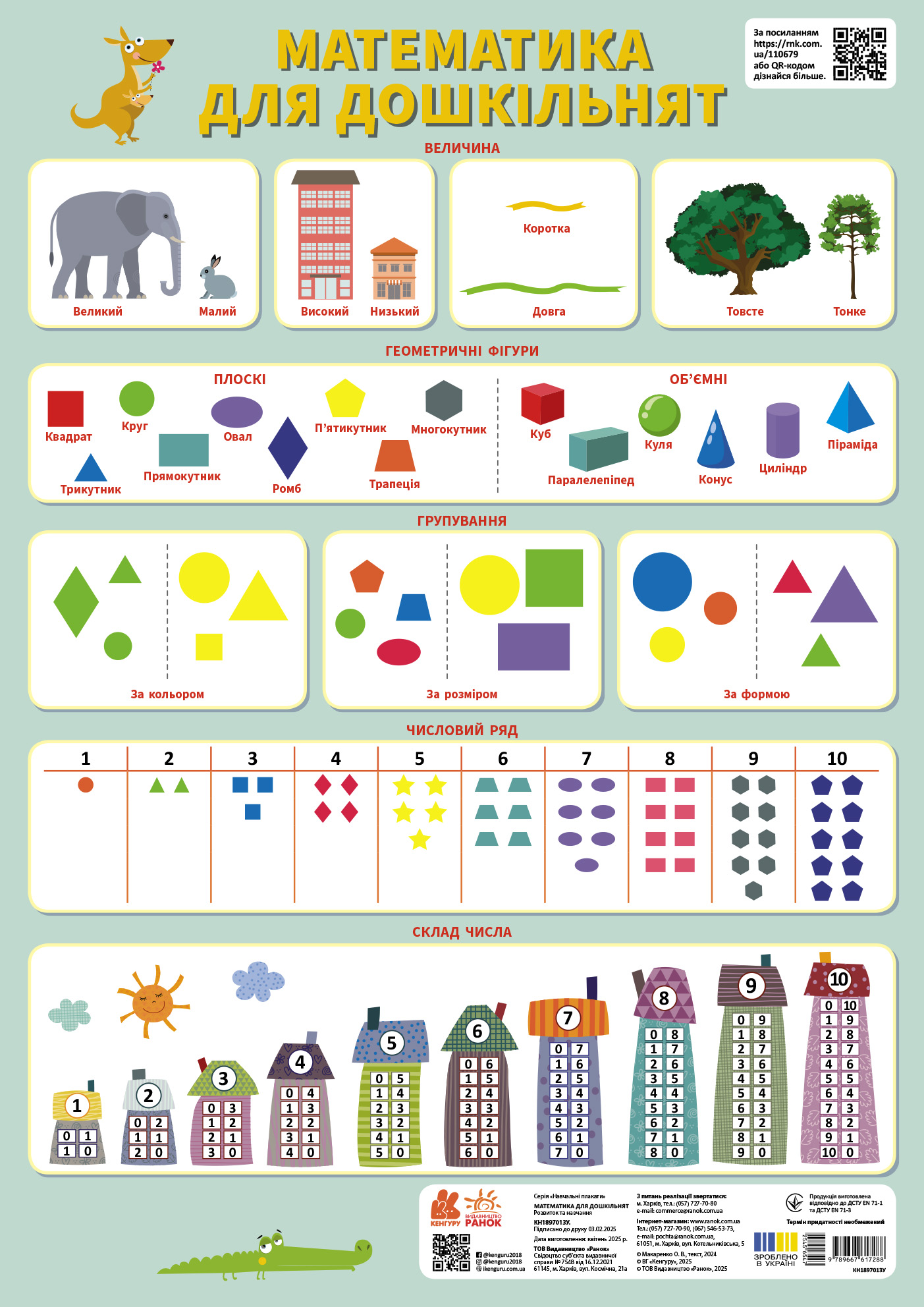Навчальний плакат «Математика для дошкільнят» сприяє опануванню дітьми основних математичних понять, як-от: величина, форми, геометричні фігури, групування фігур за певними ознаками, числовий ряд, склад числа. Наочність допоможе дітям краще запам’ятати матеріал і добре підготуватися до школи. А QR-код, який є на плакаті, дозволить дізнатися більше цікавої пізнавальної інформації.