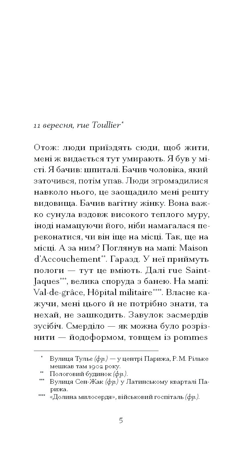 «Недужий данець приїздить до Парижа на оглядини власного передсмертя. Серед трамваїв і безликих містян, які замість обличчя мають маску (та ще й не одну, а десятки), готичних замків і середньовічних гобеленів із зображенням Дами та Єдинорога Мальте Бриґґе натрапляє на незнайомця, чи на свого двійника, а чи на явленого Господа — хтозна. Чи це осяяння й прозріння, а чи забуття — навряд можна збагнути в цій круговерті зі спогадів дитинства, історії родини Бриґґе, містичних видінь і відвідин госпіталю для епілептиків.