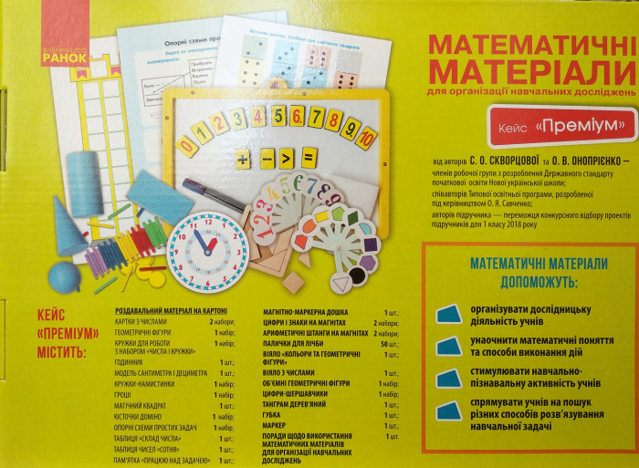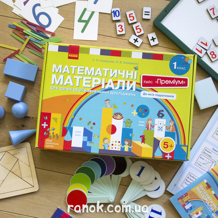 «Математичні матеріали для організації навчальних досліджень. Кейс “Преміум”. 1 клас» допоможуть організувати дослідницьку діяльність учнів, унаочнити математичні поняття та способи виконання дій, стимулювати навчально-пізнавальну активність учнів, спрямувати учнів на пошук різних способів розв’язування навчальної задачі.