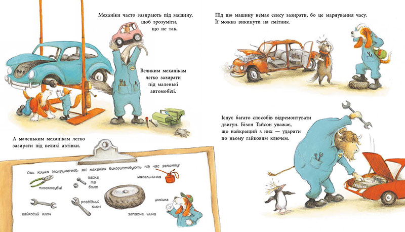 Маленькому Ділану подобається бути в автосервісі свого татка! Колись він також навчиться усього! А вчитися треба багато, адже механік повинен вміти полагодити все, що має колеса. Під капотом автобуса заховалась курка? Не біда! Слон сів на автівку, замість того, щоб сісти в неї? Команда супермайстрів готова до найскладніших викликів!