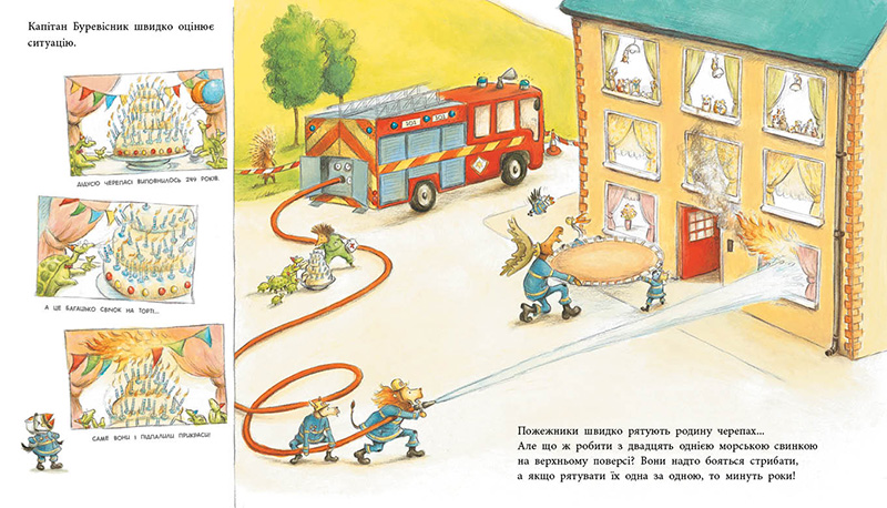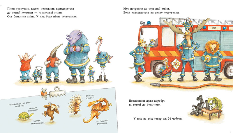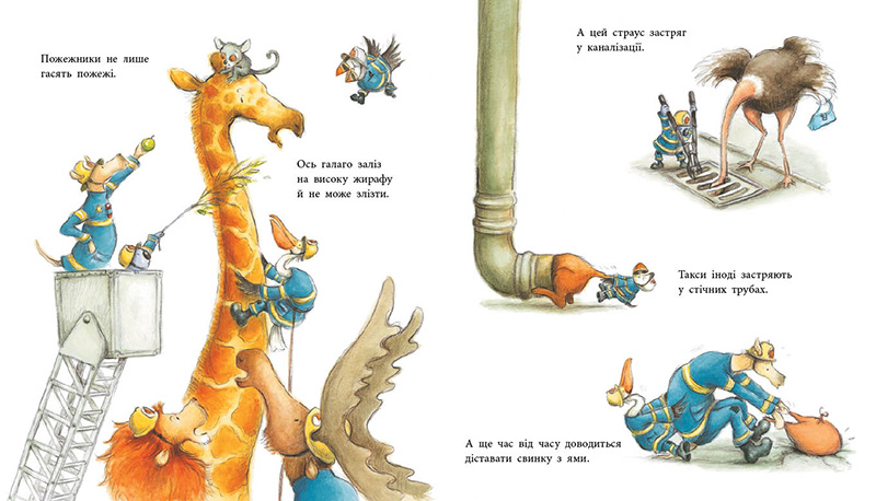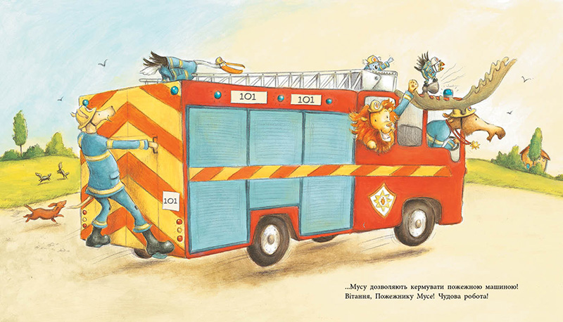 Ві-і-і-у! Ві-і-і-у! На допомогу мчать тварини-пожежники! Лось Мус мріє сісти за кермо пожежної машини. Але спершу він має здобути досвід. Йому доведеться навчитися швидко підійматися по драбинах, вправлятися з вогнегасником і вирушити у кілька сміливих рятувальних операцій. Справжня слава приходить, коли він рятує двадцять одну морську свинку з квартири на верхньому поверсі. (продовження – анотац.3)