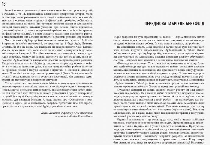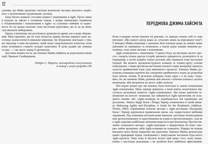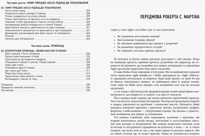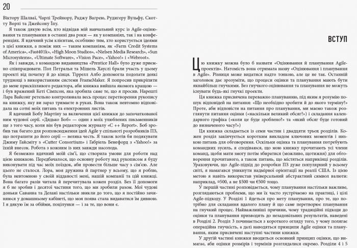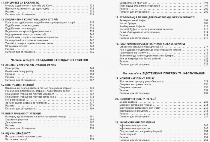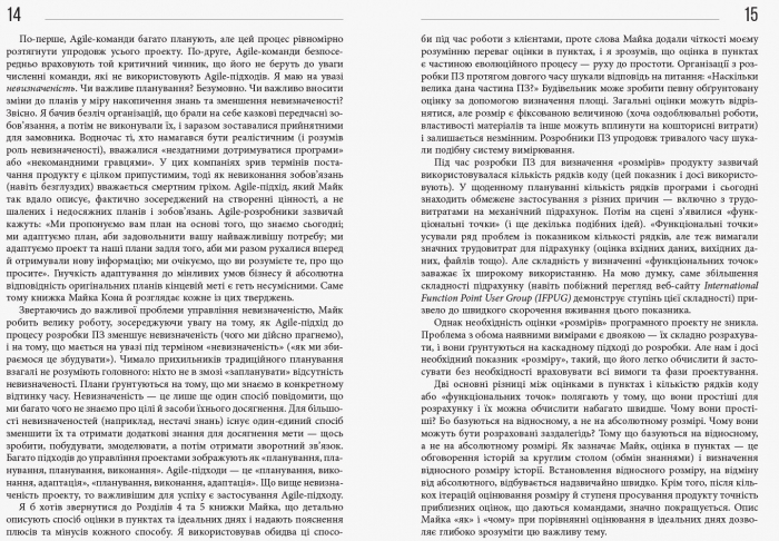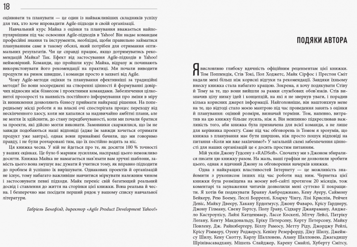 Книжка Майка Кона — одне з найкращих видань, присвячених гнучким підходам до розробки ПЗ. Автор презентує ретельно випробувані методи успішної роботи з декількома рівнями планування й оцінювання, необхідними в Agile. Чи не вперше тут детально описано процеси, а також розкрито таємниці створення, управління та поширення відмінного ПЗ, що є дуже важливим для бізнесу.