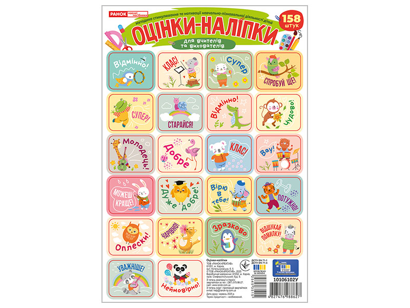 Оцінки-наліпки— це простий і дієвий спосіб мотивувати дитину. Жодних цифр — тільки радість і підтримка. Наліпки яскраві, з кумедними героями й добрими словами. Діти чекають їх із захопленням. Це винагорода за старанність, охайність або гарну поведінку. Ідеально підходять для вихователів і вчителів початкової школи. Наліпки легко приклеюються до зошитів, щоденників чи альбомів. Кожна — це маленька перемога і порція натхнення. У наборі — 4 аркуші (160×230 мм), усього 158 наліпок. Робіть кожен день дитини особливим!