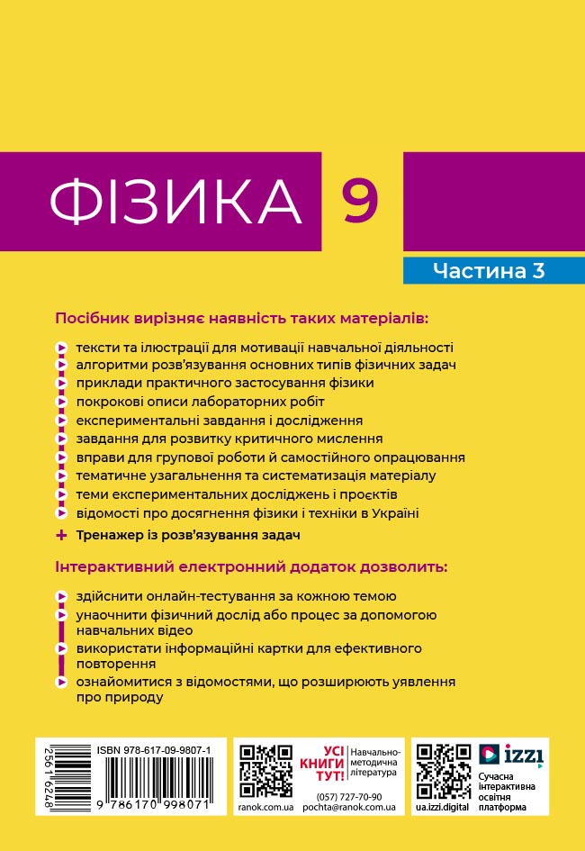 Посібник містить необхідний навчальний матеріал для опрацювання курсу фізики у 9 класі. Видання вирізняє наявність таких матеріалів: питання для мотивації навчальної діяльності, алгоритми розв’язування основних типів фізичних задач, експериментальні завдання, завдання для самооцінювання, покрокові описи лабораторних робіт, тематичне узагальнення й систематизація матеріалу тощо.