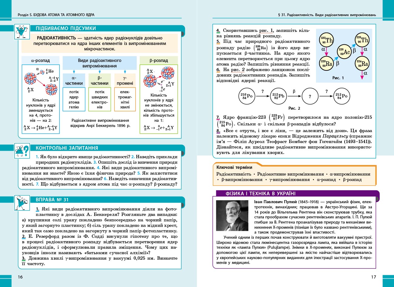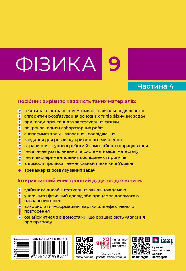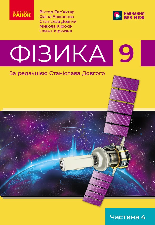 Посібник містить необхідний навчальний матеріал для опрацювання курсу фізики у 9 класі. Видання вирізняє наявність таких матеріалів: питання для мотивації навчальної діяльності, алгоритми розв’язування основних типів фізичних задач, експериментальні завдання, завдання для самооцінювання, покрокові описи лабораторних робіт, тематичне узагальнення й систематизація матеріалу тощо.