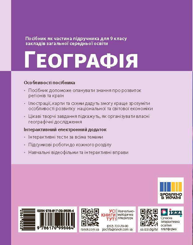 Пропонований посібник створено відповідно до модельної навчальної програми «Географія. 6—9 класи» для закладів загальної середньої освіти (авт. Запотоцький С. П. та інші). Система завдань враховує індивідуальну, групову, проектну навчальну діяльність.