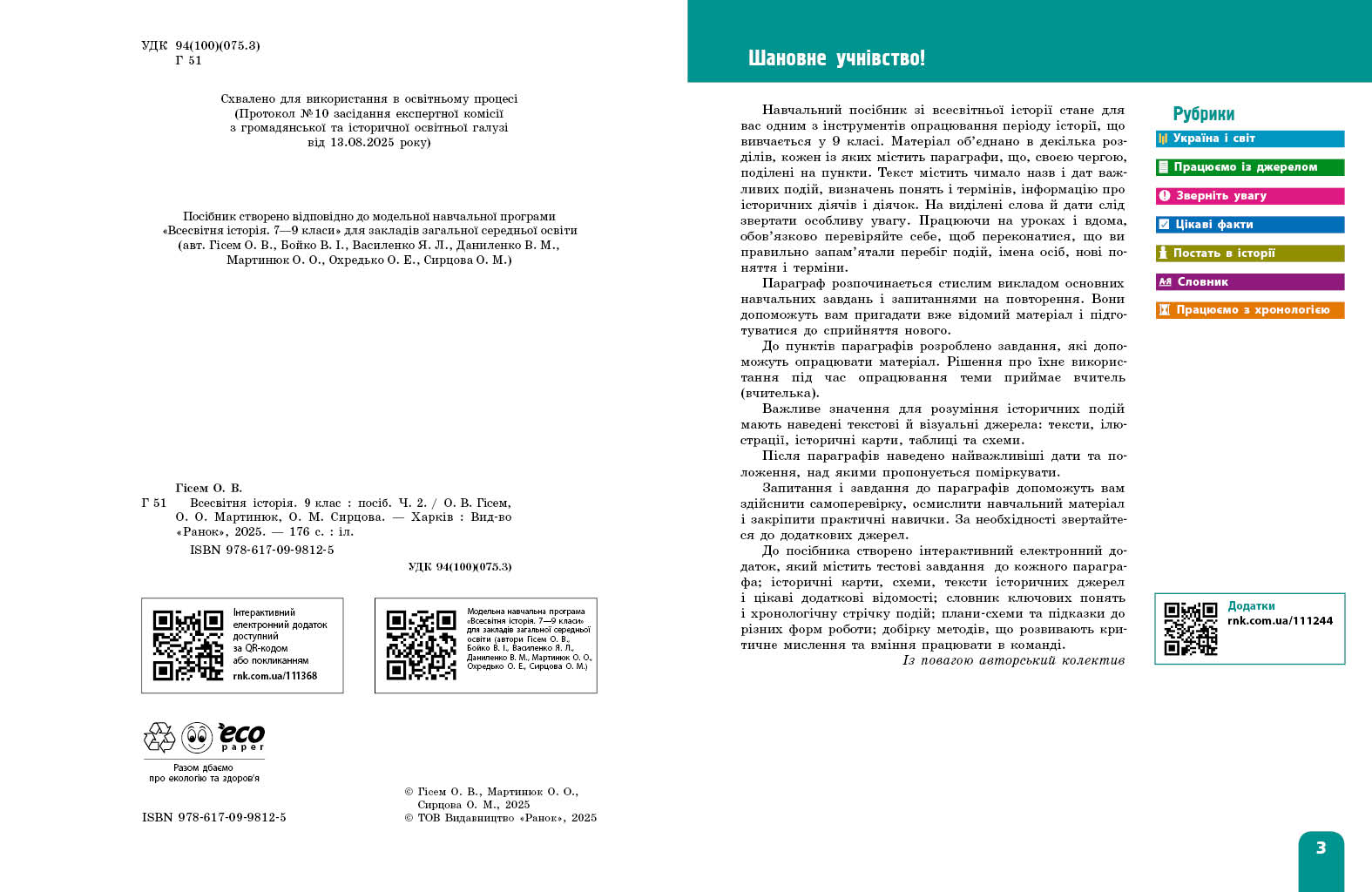 Пропонований посібник створено відповідно до модельної навчальної програми «Всесвітня історія» (авт. О. Гісем, В. Бойко, Я. Василенко, В. Даниленко, О. Мартинюк, О. Охредько, О. Сирцова). Він поєднує у собі функції підручника і робочого зошита, що сприяє успішному засвоєнню учнями базових знань та формуванню навичок самостійної роботи.