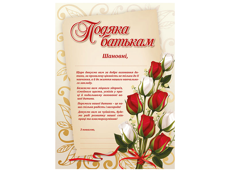 Подяка батькам (з квітами) – витончене визнання турботи та любові! Ця елегантна подяка стане чудовим способом висловити щиру шану на випускних, святкових заходах чи урочистих подіях. Вишуканий дизайн та символічність: ніжні пастельні відтінки та текстурований фон додають витонченості; букет біло-червоних троянд символізує повагу, вдячність і тепло сердець; надрукована на якісному крейдованому папері (150 г/м²) для довговічності. Ідеально підходить для шкіл, дитячих садків, випускних