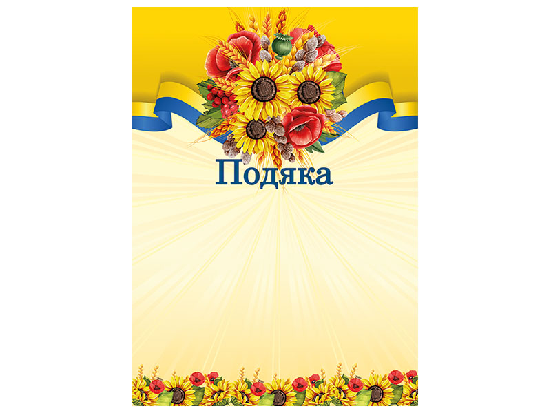 Урочиста подяка формату А4 з патріотичною жовто-блакитною стрічкою, прикрашена квітковим орнаментом зверху і знизу. Створена для вручення на святкових, офіційних чи навчальних заходах. Поєднання національних символів і теплих кольорів підкреслює щирість вдячності, повагу та урочисту атмосферу.