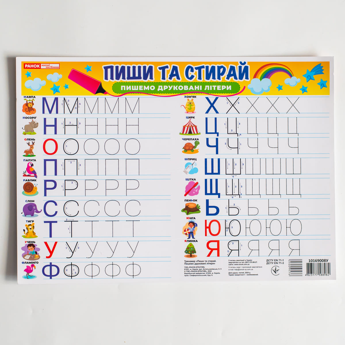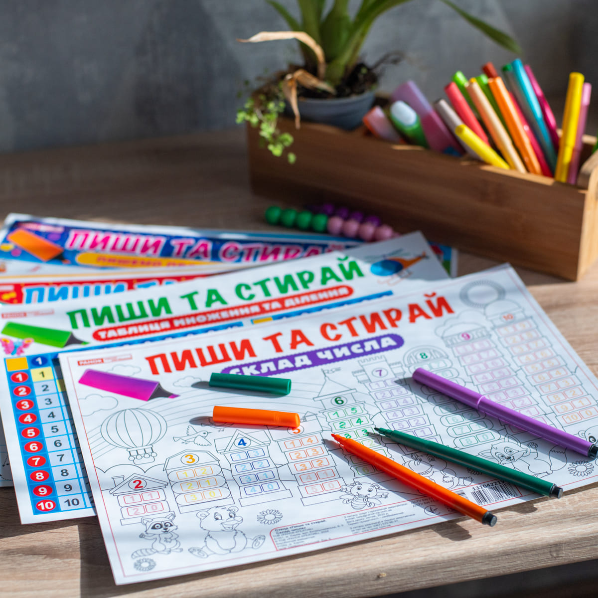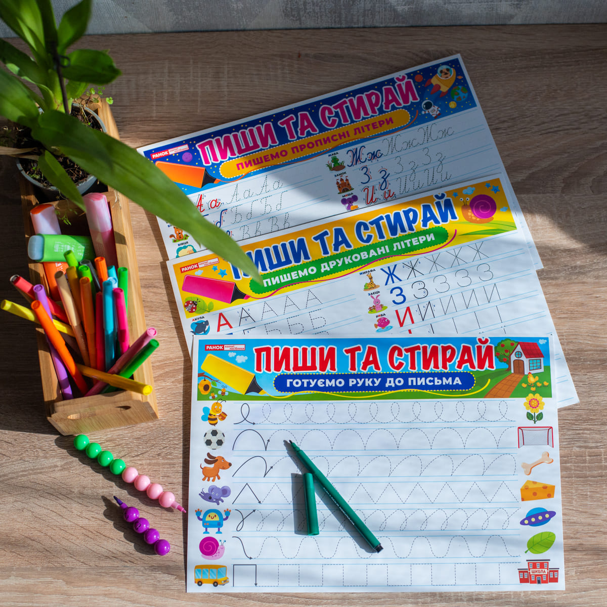Тренажер “Пиши-стирай” – це двосторонній стенд для швидкого навчання письма. Він створений за сучасними вимогами освітніх програм та призначений для дошкільнят і учнів початкової школи.