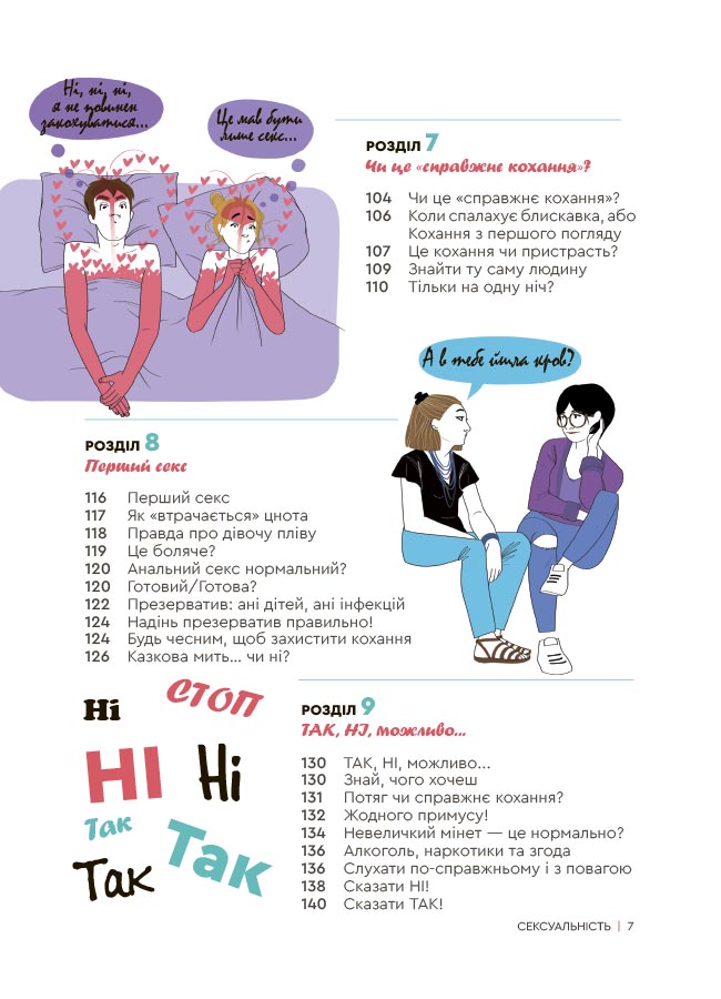Це кохання чи лише потяг? Як відмовити і не образити? Чому першого разу боляче? А якщо він/вона шукає лише секс «на одну ніч»? Що насправді подобається дівчатам? А хлопцям? Чи в житті так, як показують у порно?