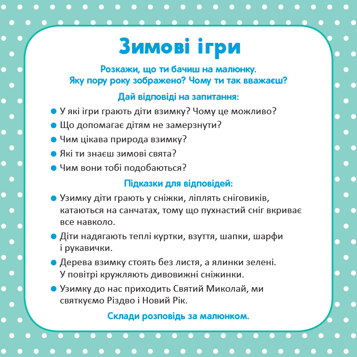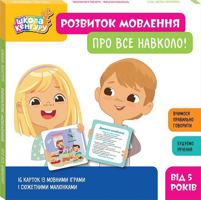 .Набір «Школа Кенгуру. Розвиток мовлення. Про все навколо!» містить 16 карток, на яких з одного боку — сюжетні малюнки на певну тему, а з іншого – вправи, за допомогою яких дитина навчається будувати різні речення. Складаючи розповіді за малюнком, дитина вчиться вживати у мовленні повні речення, прості й складні, правильно вживати прийменники, прислівники, багатозначні слова, синоніми й антоніми, слова ввічливості й привітання. Набір можна використовувати, навчаючи дітей з особливими освітніми потребами.